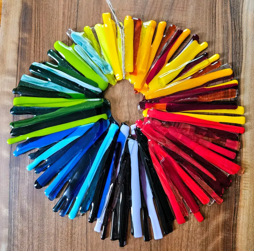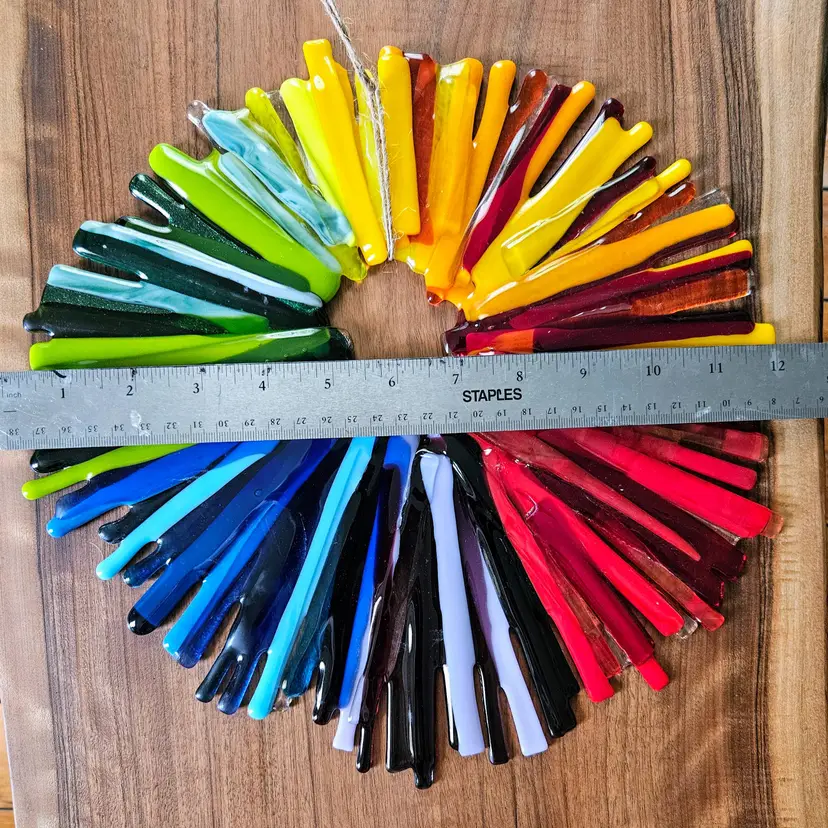 Add a bit of color to the garden, the patio or any room in the house! I create these one-of-a-kind rainbow swirls by cutting hundreds of strips of glass out of all different colors, opaque, transparent, iridescent.... next, I arrange the pieces in a circular pattern, leaving an opening in the middle. When I have this completed, it goes into the kiln for about 24 hours. Once it is cool, I typically add a few more pieces here and there and fire it again. After it is cool and cleaned up, I add twine for hanging and it's ready to go!