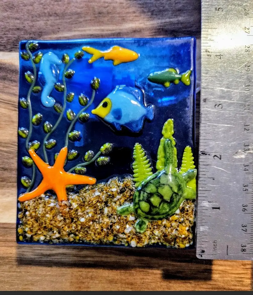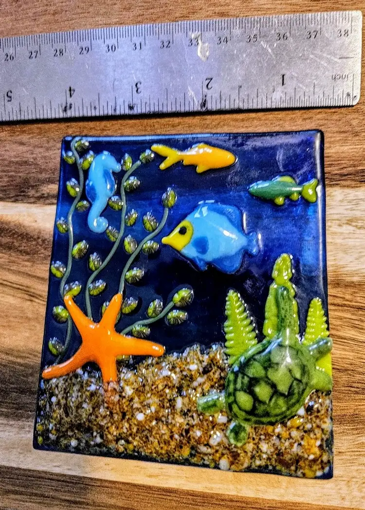 I created this night light by first making the fish and shells. I mixed glass powder and water and layer it in silicone molds, freeze it solid and then pop them out onto a kiln shelf and fire overnight. Well the pieces fire, I cut out the background glass and make the background. I do this using different pieces of glass and glass powder. I then add the fish, shells and details and fire again overnight. What's cool, I clean it up and attach the night light hardware. Fabulous way to add a little pop of color in a corner or bedroom, bathrooms..