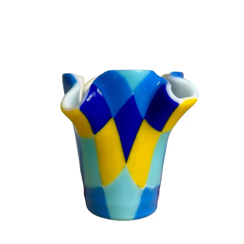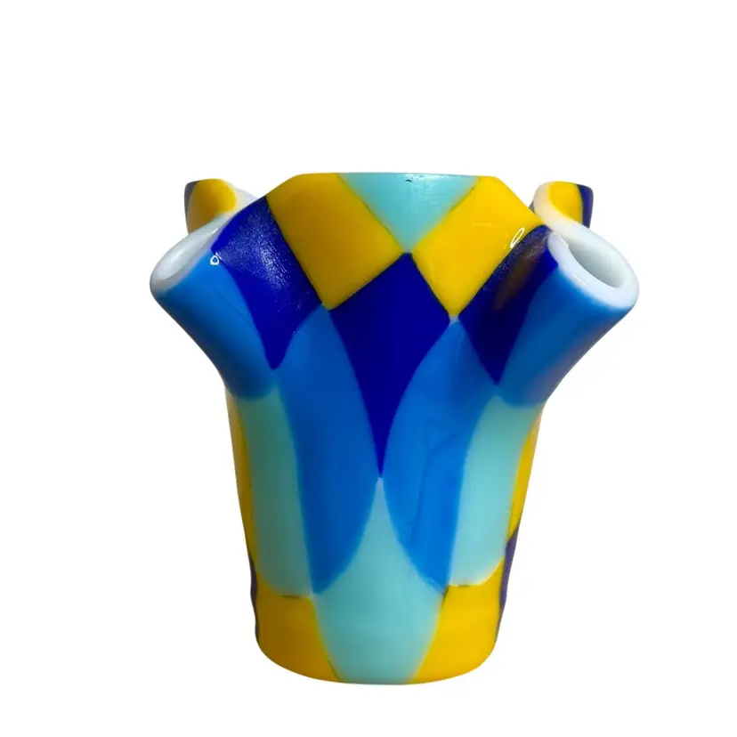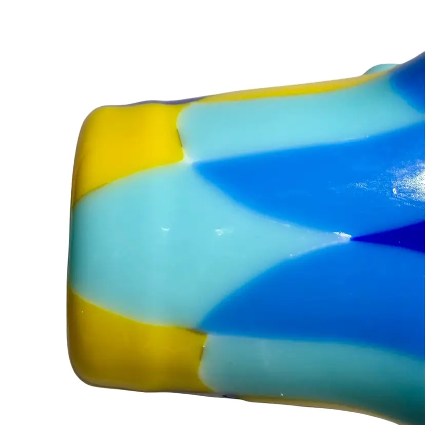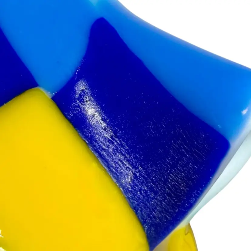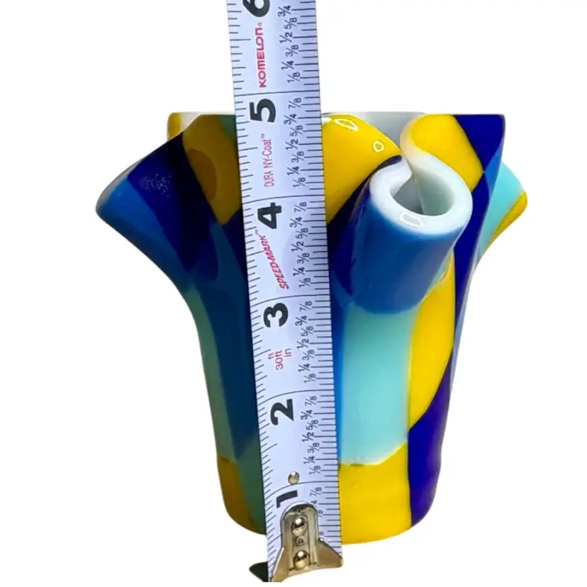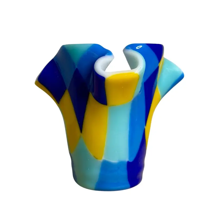 Modern Fused glass art deco vase, bright blues and yellow. Signed KL.