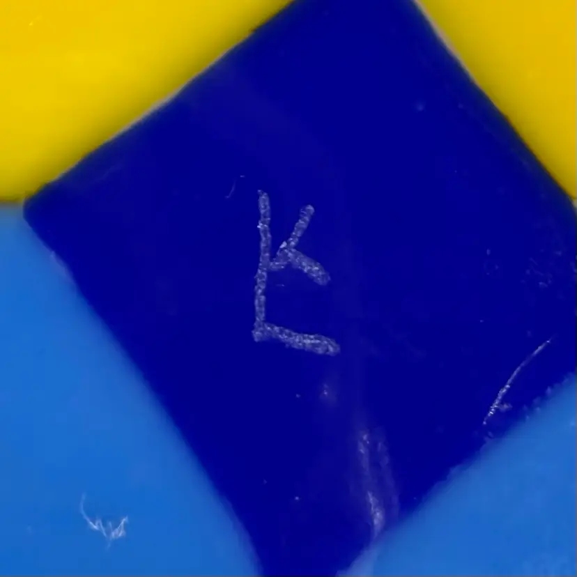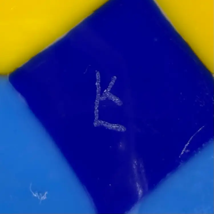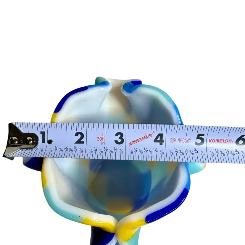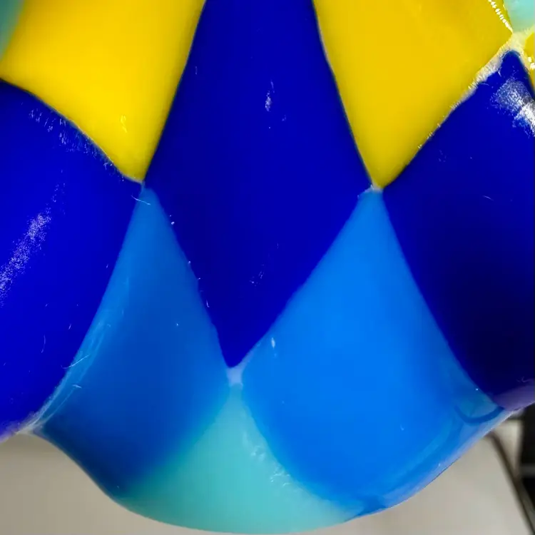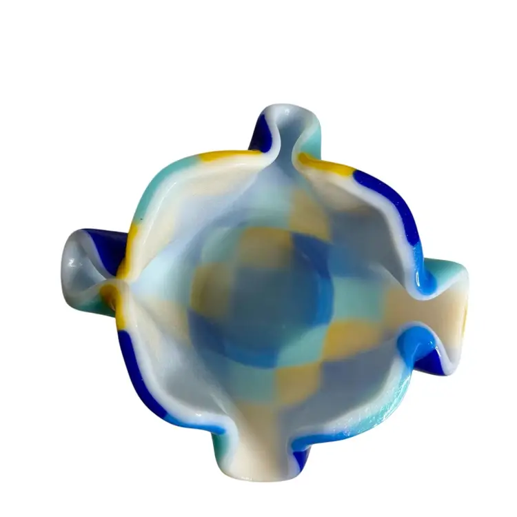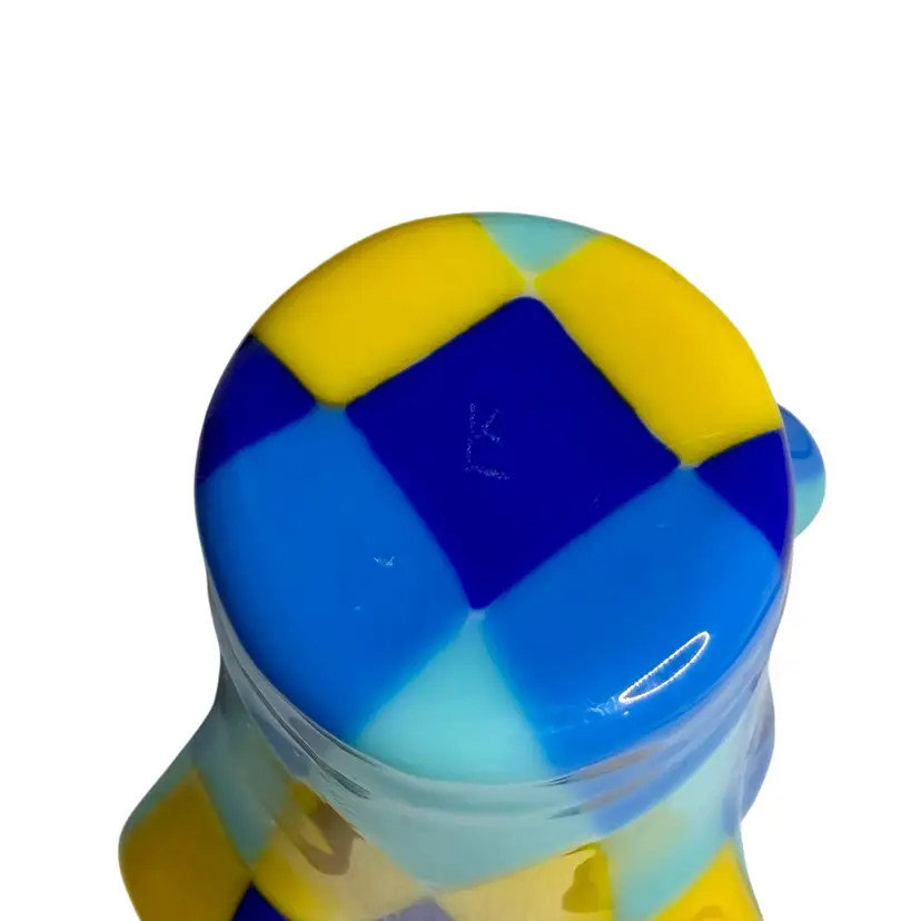 Modern Fused glass art deco vase, bright blues and yellow. Signed KL.