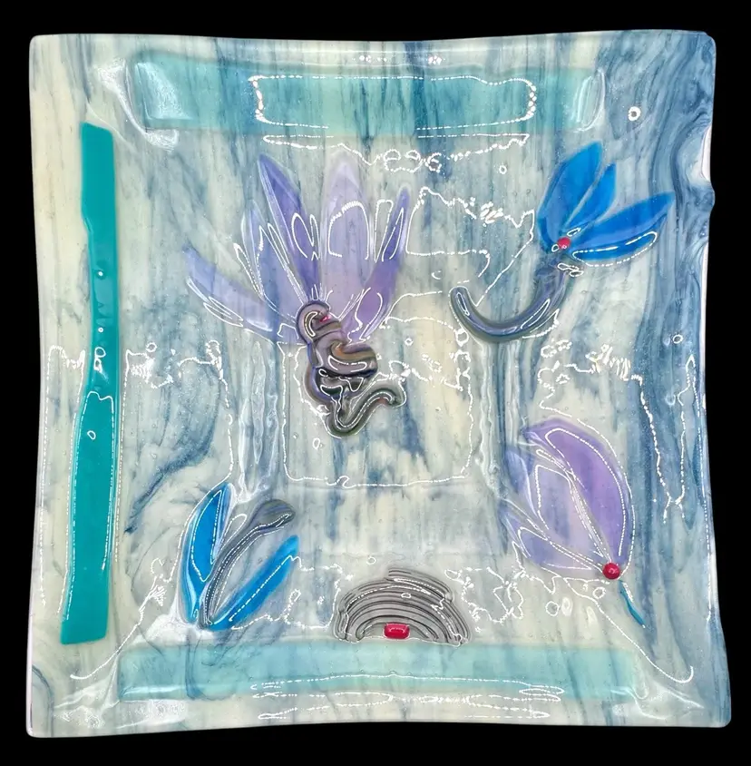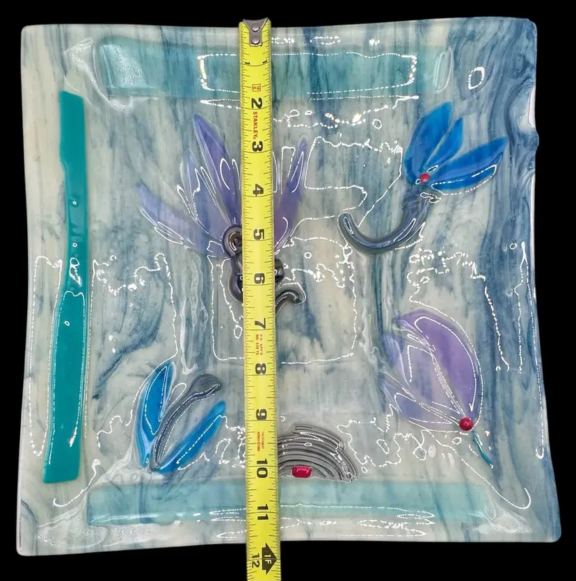 Large fused glass plate with a divot in the middle. The base glass is a streaky white and blue, with purple and blue flowers over top.