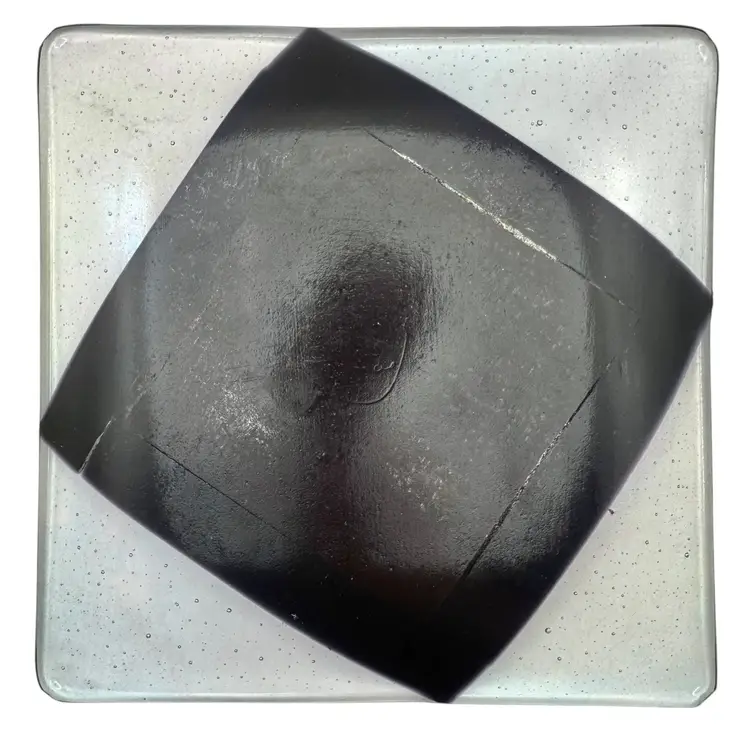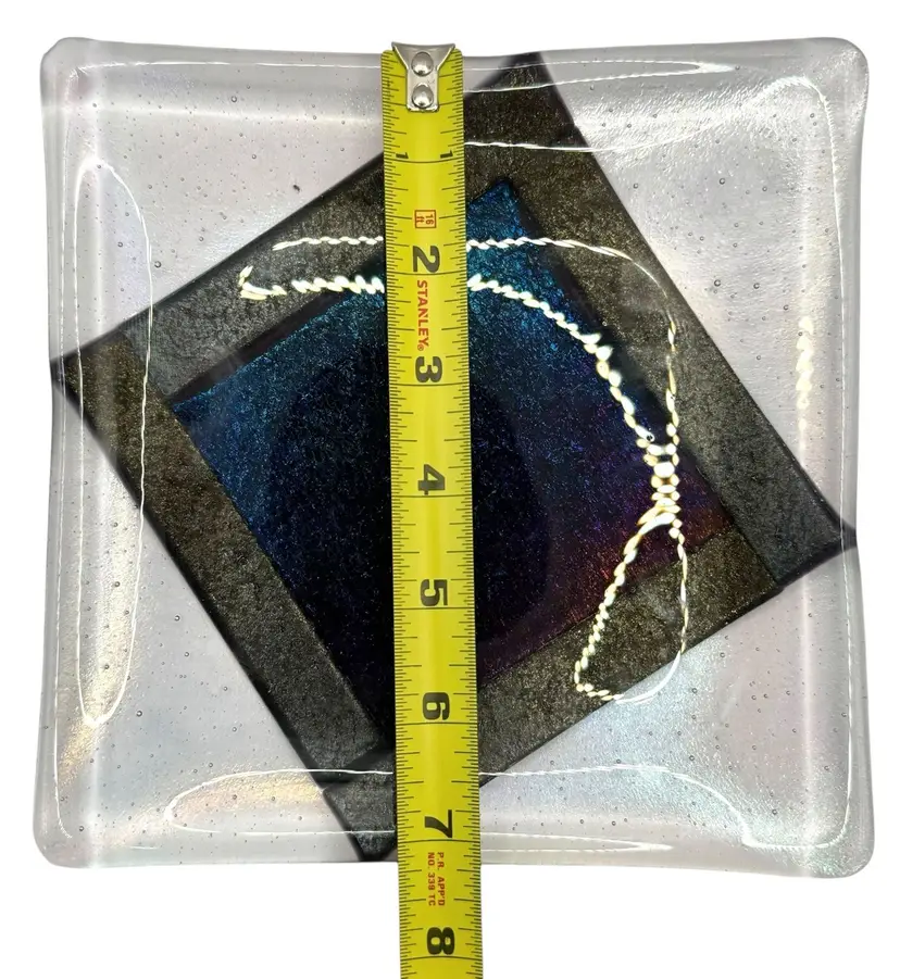 Art glass plate with a color shifting diamond with clear bubbled glass around it.