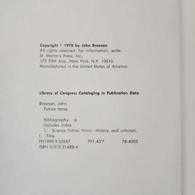 Book Title: Future Tense : the Cinema of Science Fiction Narrative Type: Nonfiction Publisher: St. Martin's Press Original Language: English Vintage: Yes Publication Year: 1978 Format: Hardcover Language: English Author: John Brosnan Features: Dust Jacket, Illustrated Genre: Performing Arts Topic: Film, Film / Genres / Science Fiction & Fantasy Number of Pages: 320 P. : Pages