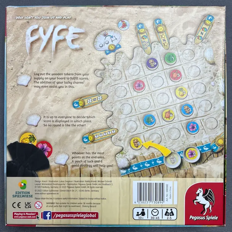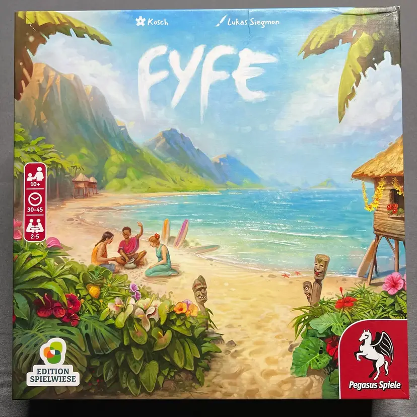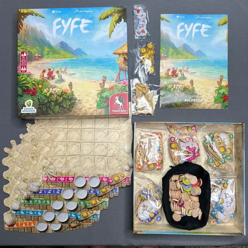 Played Once. - - The cover of FYFE shows a dreamy South Seas location with a blue sea, beach, and palm trees — but what will you find as you dig in the sand, and can you arrange your discoveries in ideal scoring combinations? Each player has their own 5x5 grid, 7 lucky charm tiles, and 15 scoring boards. The game includes 125 tokens, with each token showing one of five colors, one of five symbols, and one of five numbers (1-5). The scoring boards show conditions that you must meet in order to earn the points listed on that board, e.g., the numbers 1-5 in sequence, tokens of the same color, tokens with different symbols, three tokens of one color and two tokens of another color, etc.