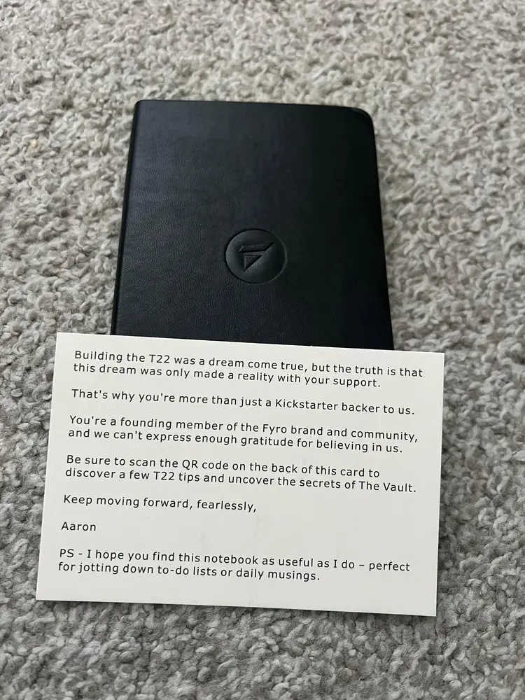 Fyro notebook (also unused) included with message and QR code that links to a video with additional details about the bag