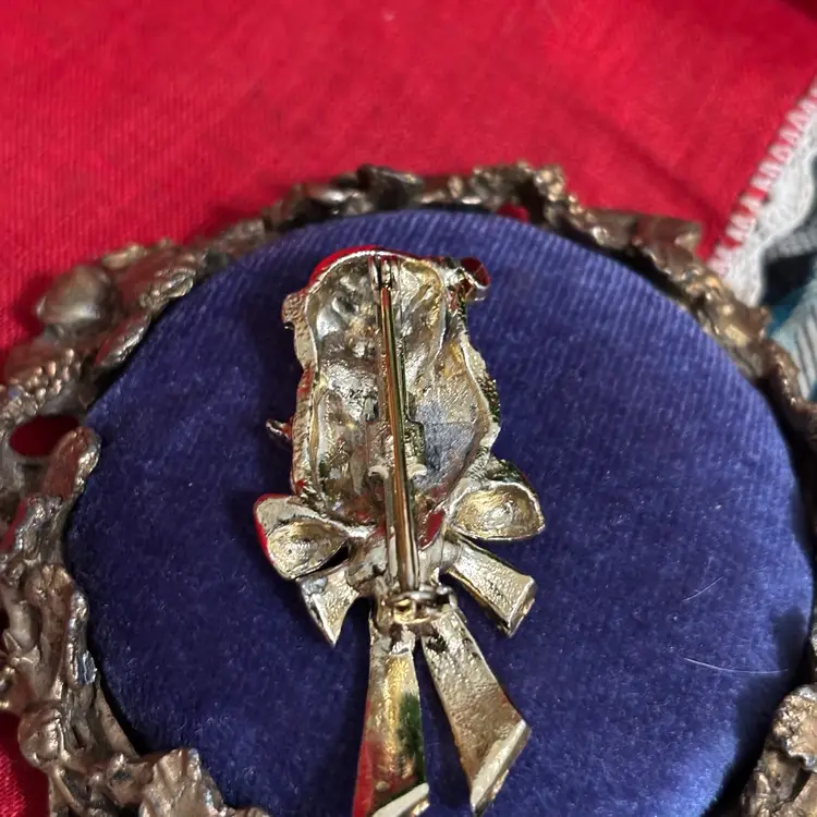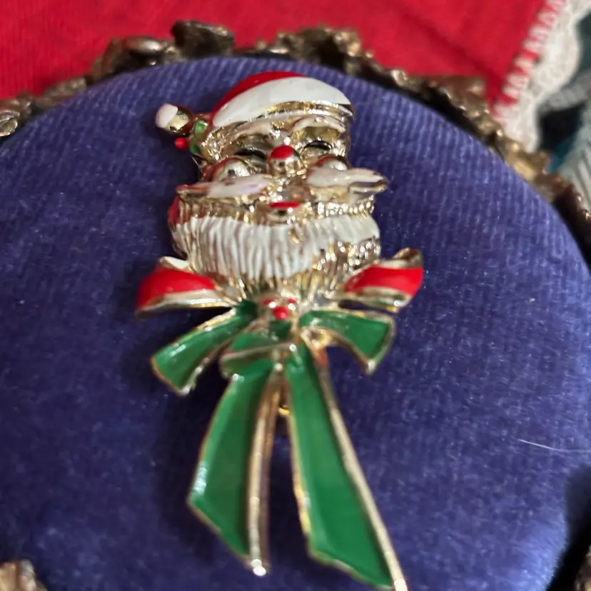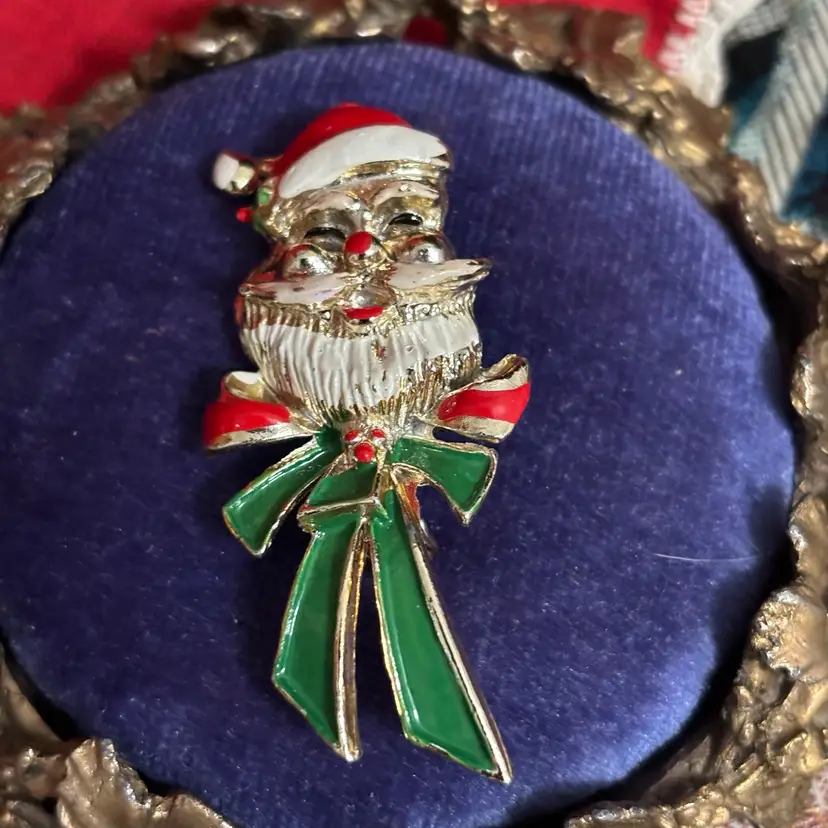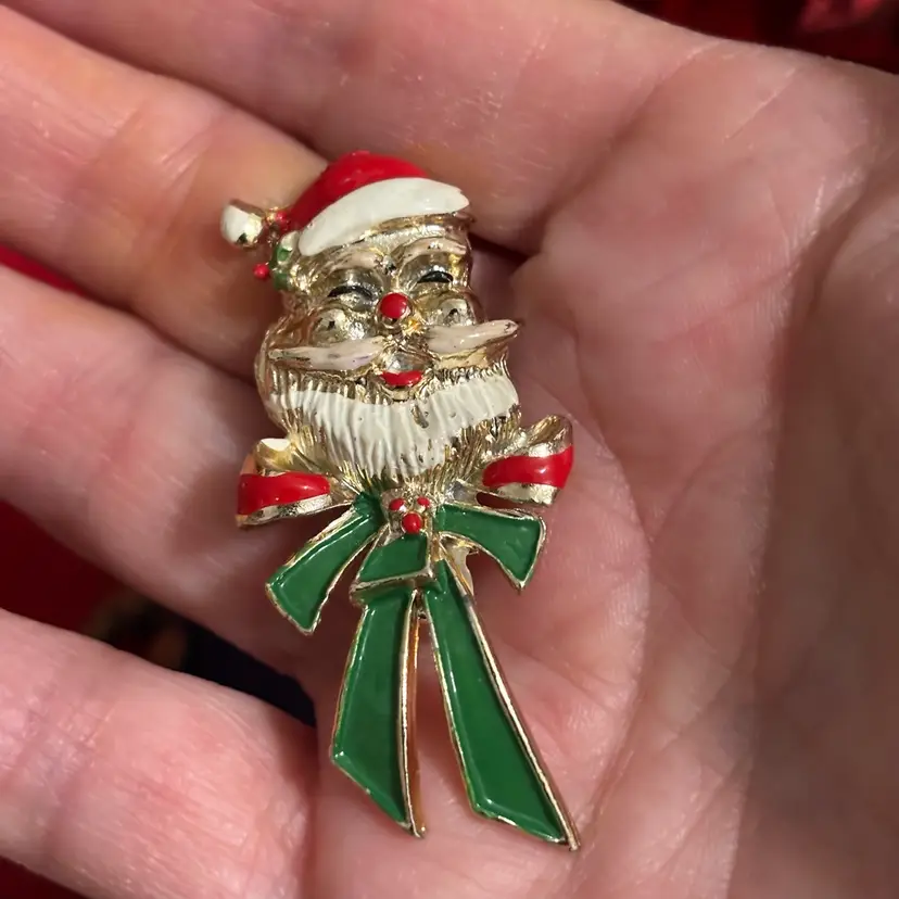Whimsical vintage Santa Claus brooch. Not marked. Safety clasp. Nice condition- no paint wear.