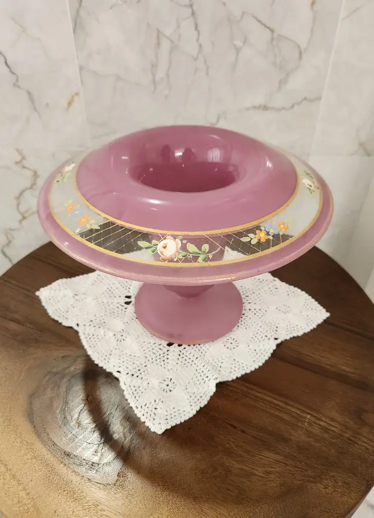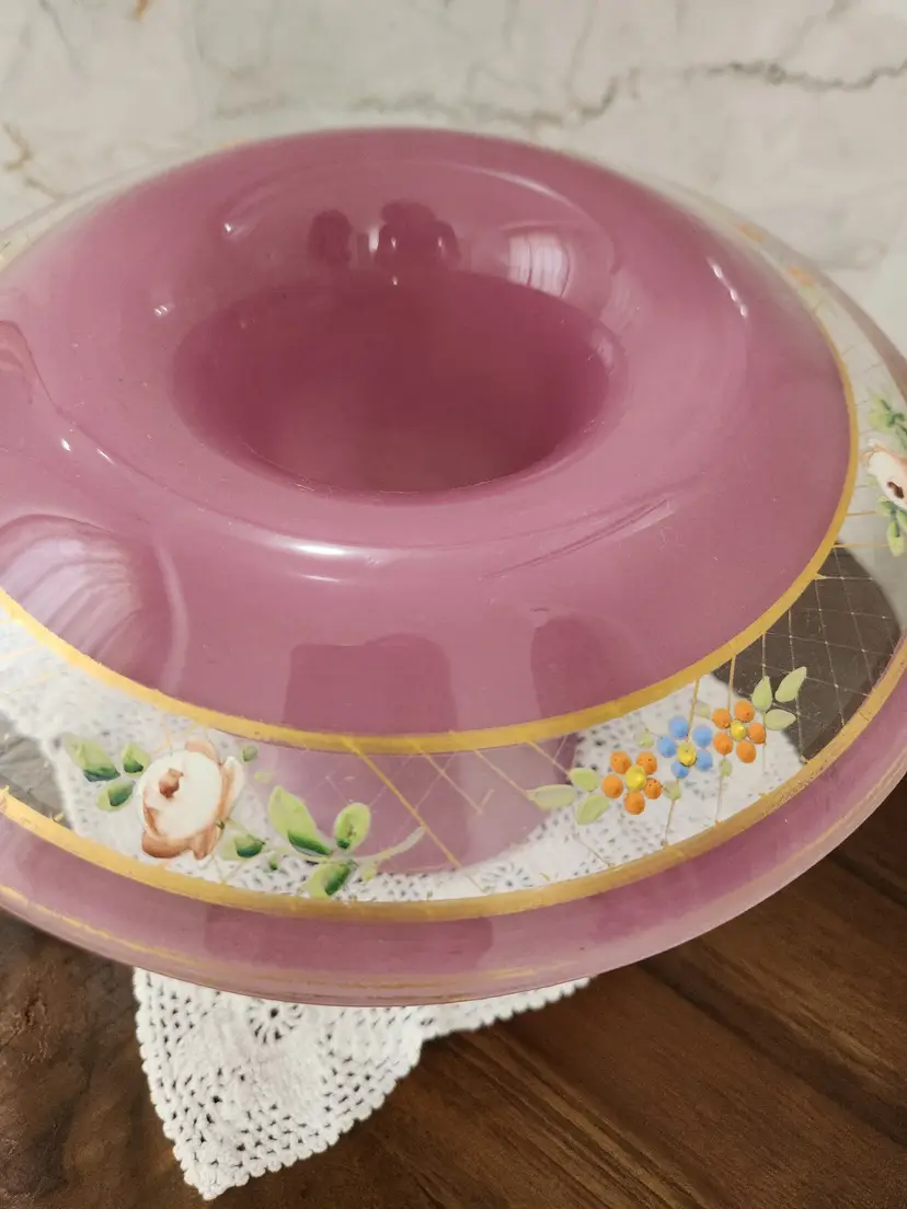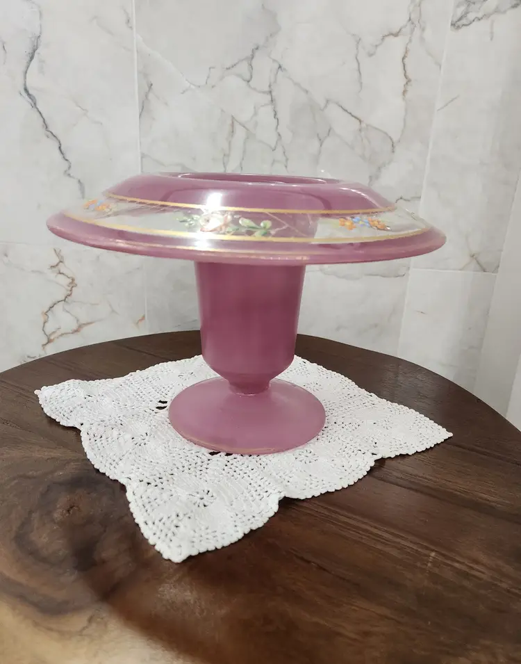 This is gorgeous Westmoreland centerpiece bowl from the 1920's or 30's. This is referred to as lavender depression glass. There are no markings other than what looks like remains of an artist signature under the rim. No chips or cracks. The outer part and underside of the top has a satin finish. The outer top and inside have a smooth glossy finish. The flowers around it were hand painted. This is truly beautiful.