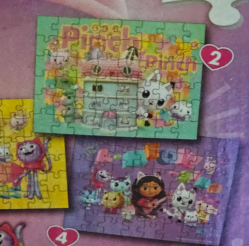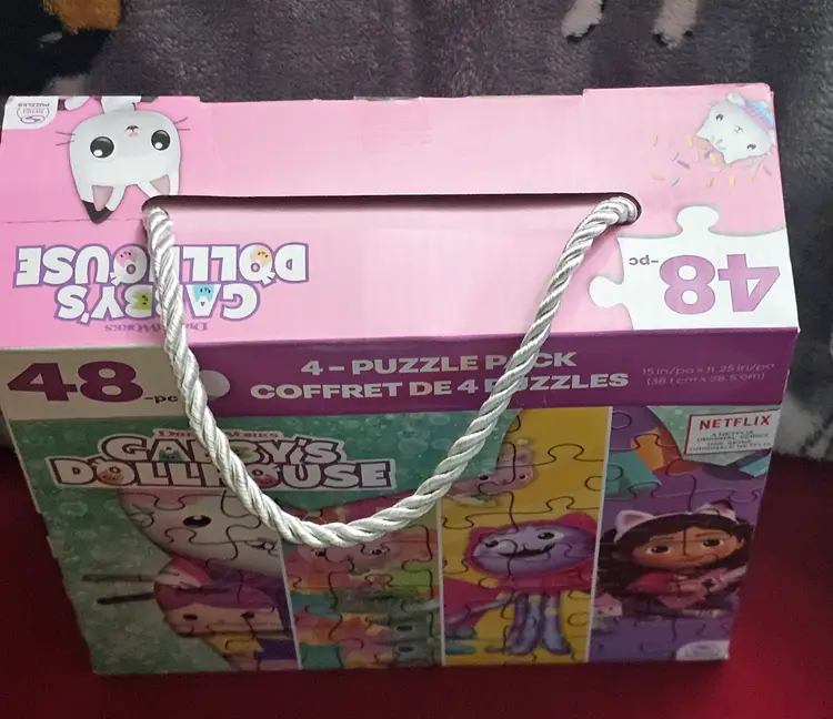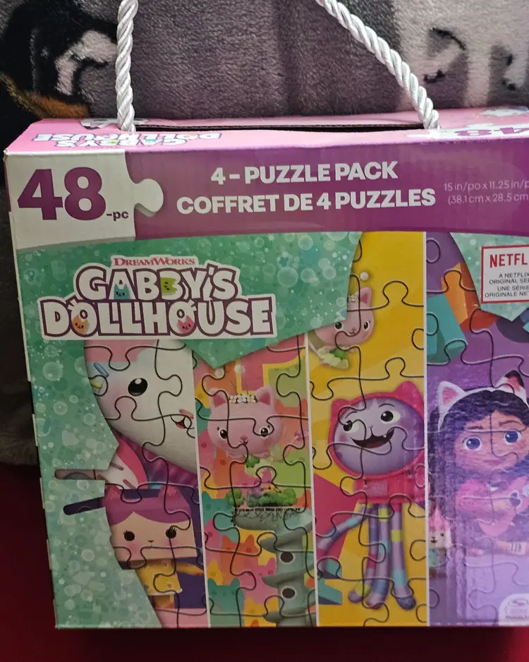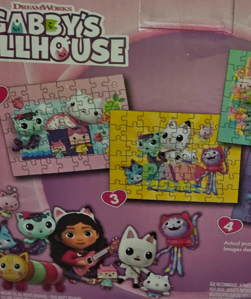 Gabby's Dollhouse Four Puzzles contain a total of 192 pieces, with each puzzle featuring characters from the popular children's television show. Made of sturdy cardboard, these interlocking puzzles are perfect for fans of Gabby. The colorful design and pet-free household make these puzzles a fun and engaging activity for kids to enjoy.