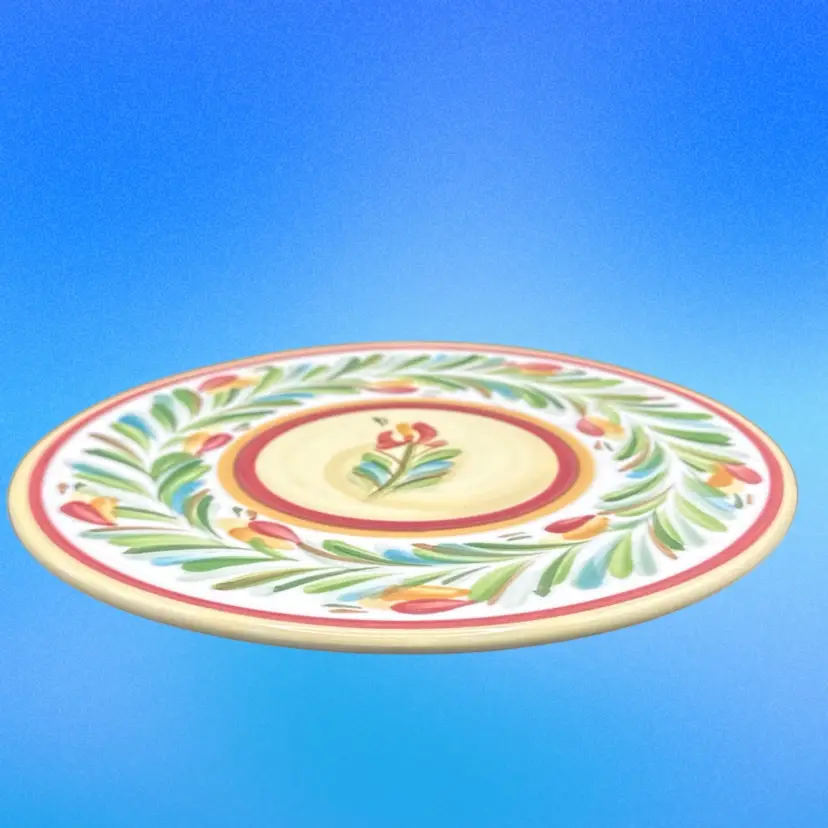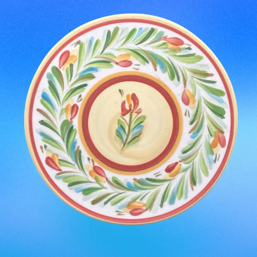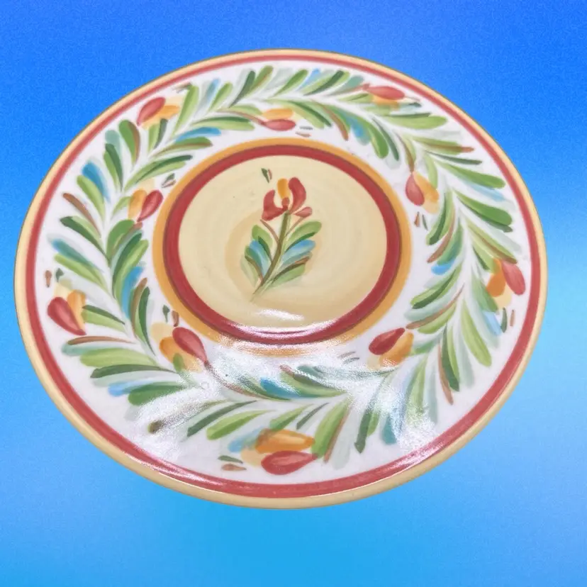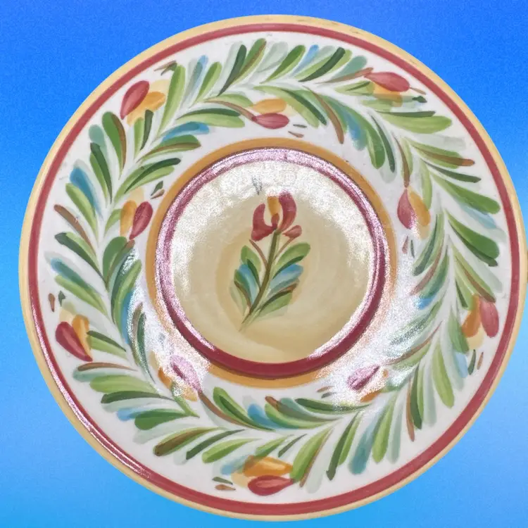 The Gail Pittman Hand painted Trivet in Sienna Red from the Garland collection is a vintage ceramic piece featuring a multicolor flower pattern. This round trivet is hand painted with a glossy finish, making it a unique addition to your decorative cookware or serveware collection. With its original production style as earthenware, this trivet reflects the craftsmanship and charm of the Gail Pittman brand, making it a standout piece for your home decor.