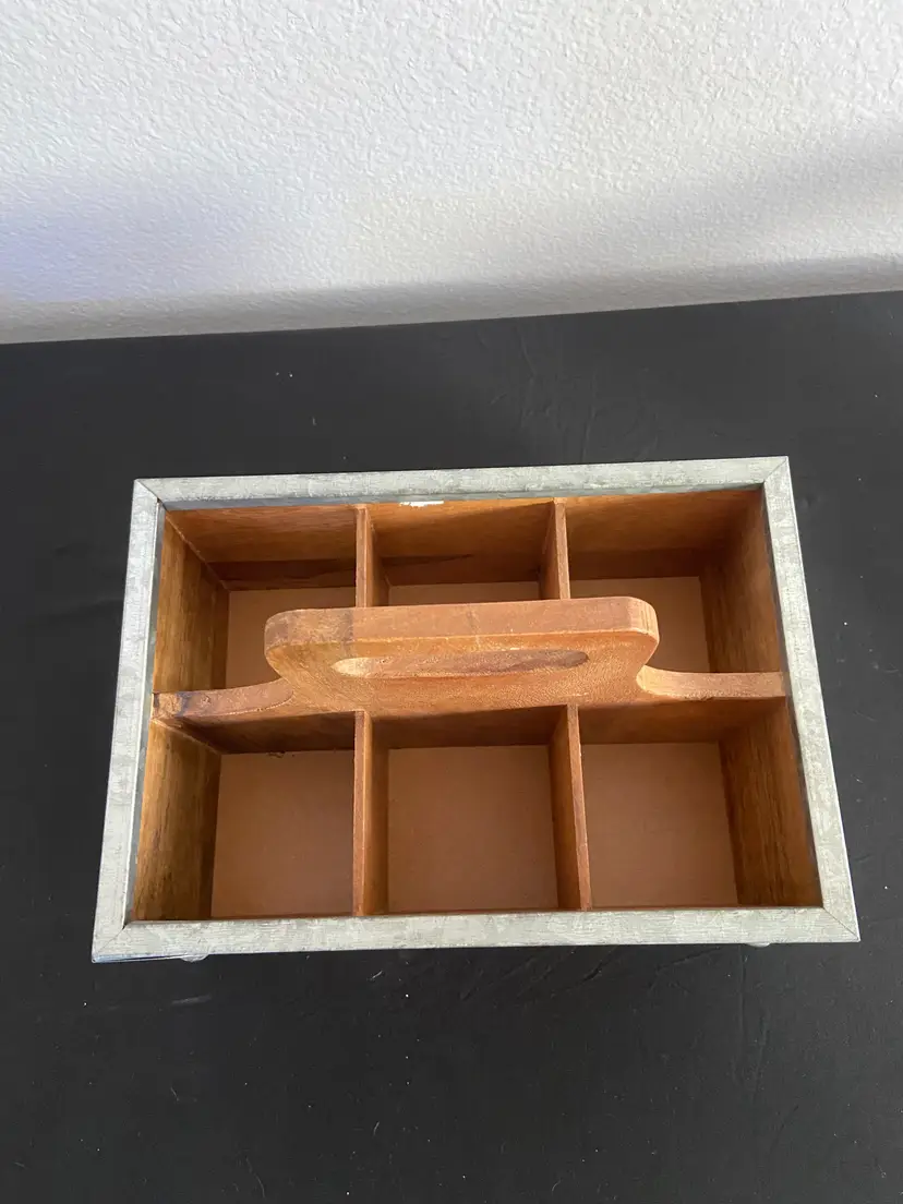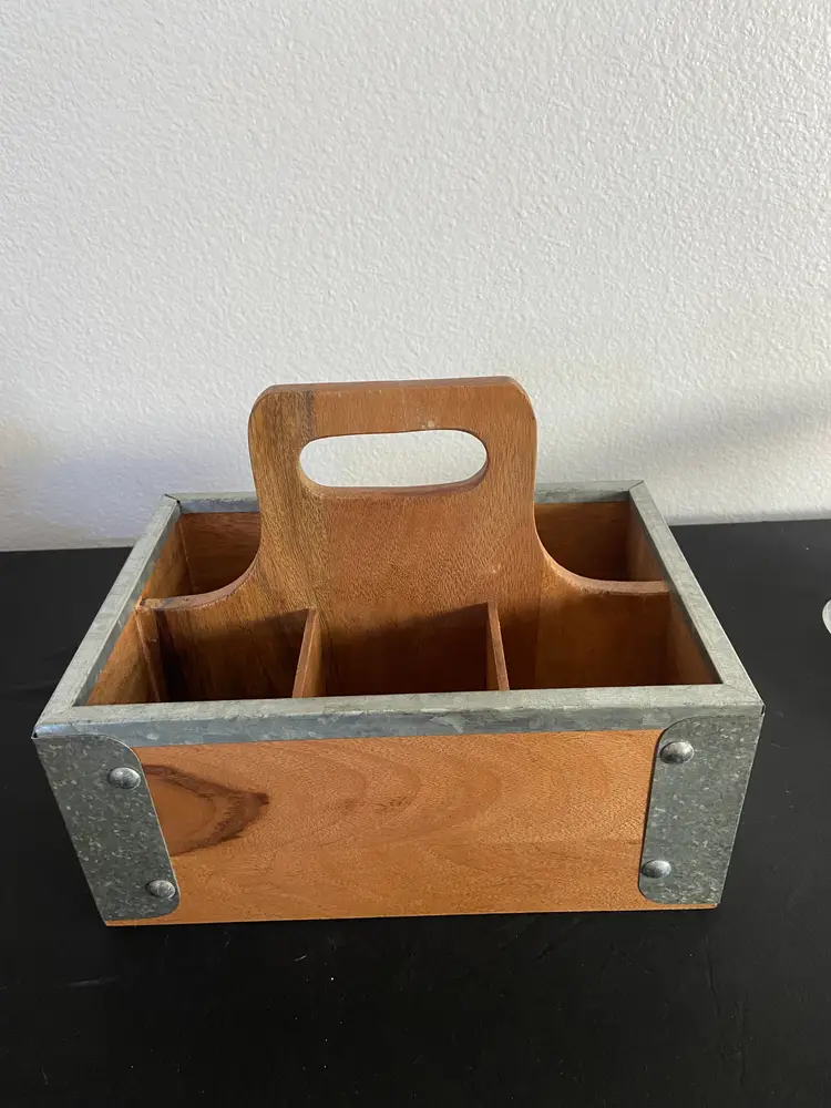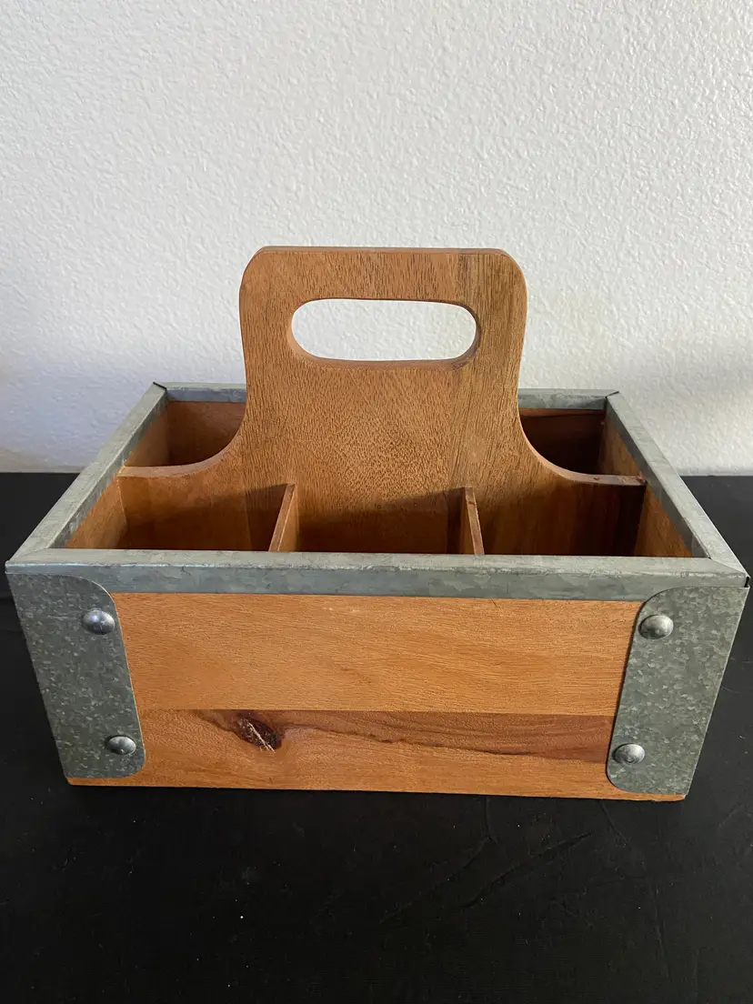 The Galvanized Metal & Wood Caddy is a stylish and functional storage basket, featuring a rectangular shape and a metallic finish. Made from a combination of wood and metal, this caddy requires no assembly and has dimensions of 10.5" x 7.5". With a height of 8.5" and a length of 10.75", this caddy is perfect for organizing household supplies and cleaning essentials in a modern and decorative way. Its sleek design and durable construction make it a versatile addition to any home or garden setting.