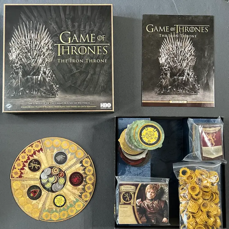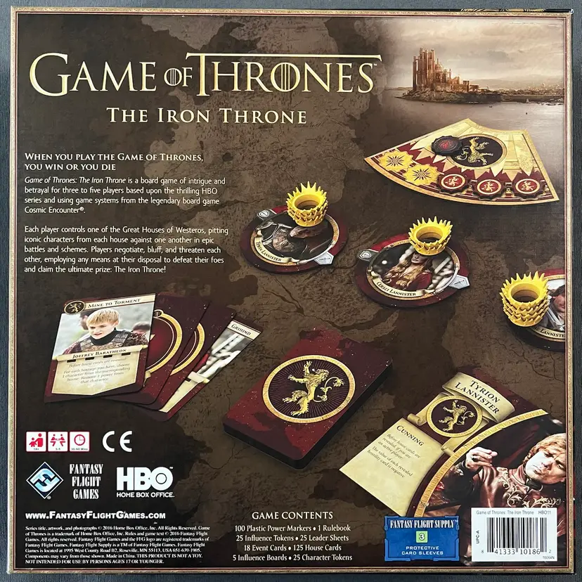 Played once. // In Game of Thrones: The Iron Throne, which uses the game systems from Cosmic Encounter, you and your friends each command one of the Great Houses of Westeros, pitting iconic characters against each other in epic battles and schemes. Negotiate, bluff, forge alliances, threaten your rivals — use every tool at your disposal to spread your influence, establish supremacy, and claim the ultimate prize: the Iron Throne! - BGG