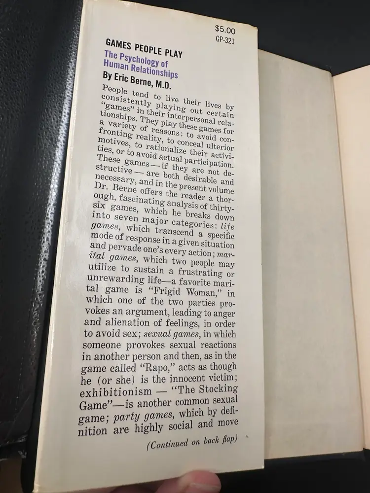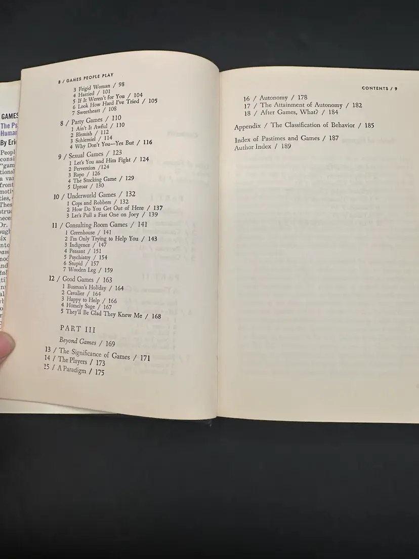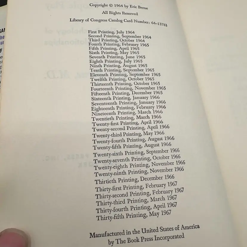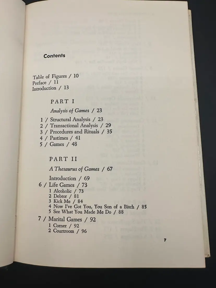 These games —if they are not destructive — are both desirable and necessary, and in the present volume Dr. Berne offers the reader a thorough, fascinating analysis of thirty-six games, which he breaks down into seven major categories.
