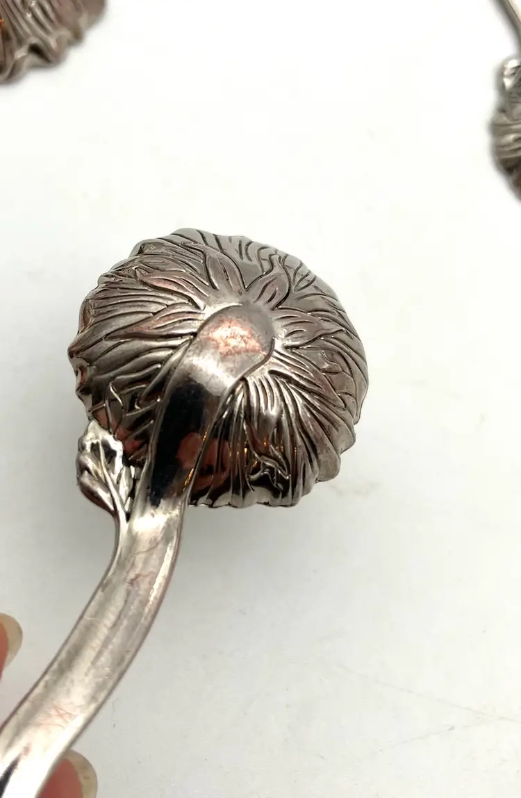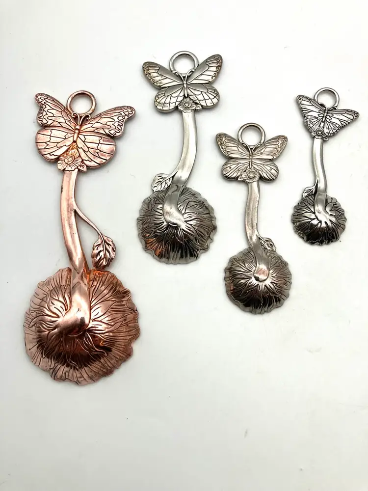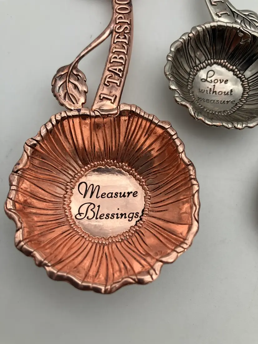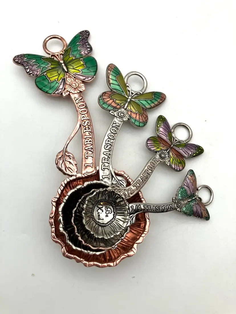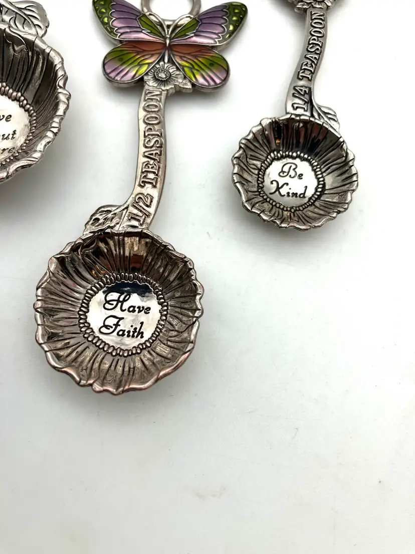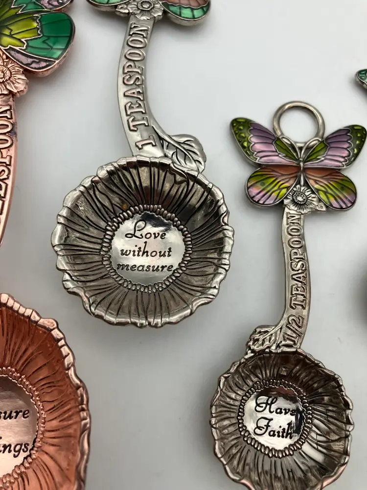 Adorable measuring spoons (Tbsp, tsp, 1/2 tsp and 1/4 tsp) with. Butterflies and sayings, “Measure blessings,” “Love without measure,” “Have Faith,” and “Be Kind.” Condition is good. There is some wear to the plating on the backs of the spoons; most noticeable with the 1/2 tsp where the copper is visible where plating has worn.. see pics. Largest spoon is 5.125 long by 1.875” wide by 0.625” deep.
