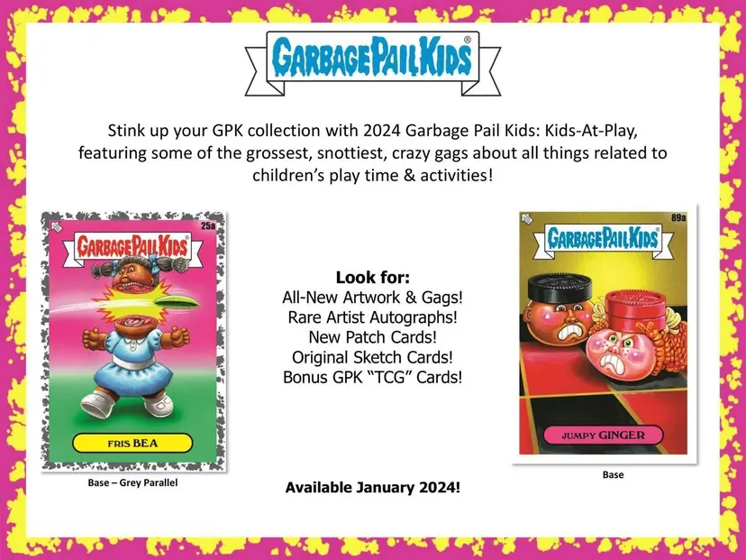 Stink up your GPK collection with 2024 Garbage Pail Kids: Kids-At-Play, featuring some of the grossest, snottiest, crazy gags about all things related to children's play time & activities!