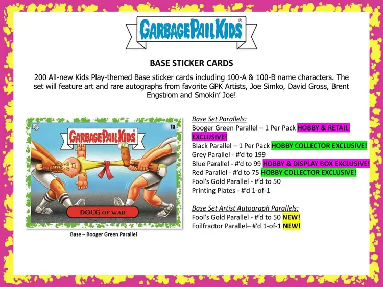 Base Sticker Cards: 200 All-new Kids Play-themed Base sticker cards including 100-A & 100-B name characters. The set will feature art and rare autographs from favorite GPK Artists, Joe Simko, David Gross, Brent Engstrom and Smokin' Joe!
