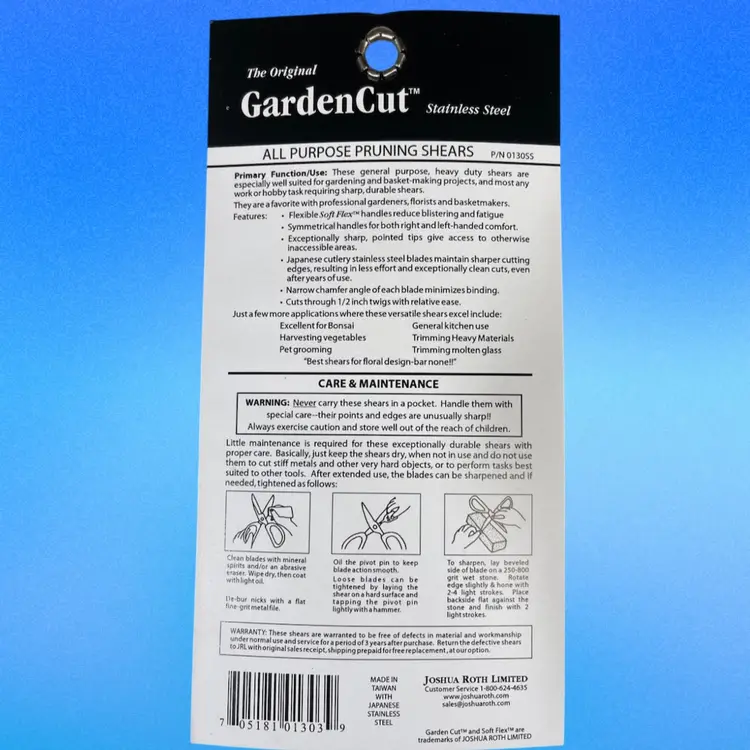 GardenCut™ Shears are also an excellent choice for use in basket weaving, trimming foam & plastic materials, general kitchen use, trimming hot molten glass during glass blowing and handicrafts of all types.