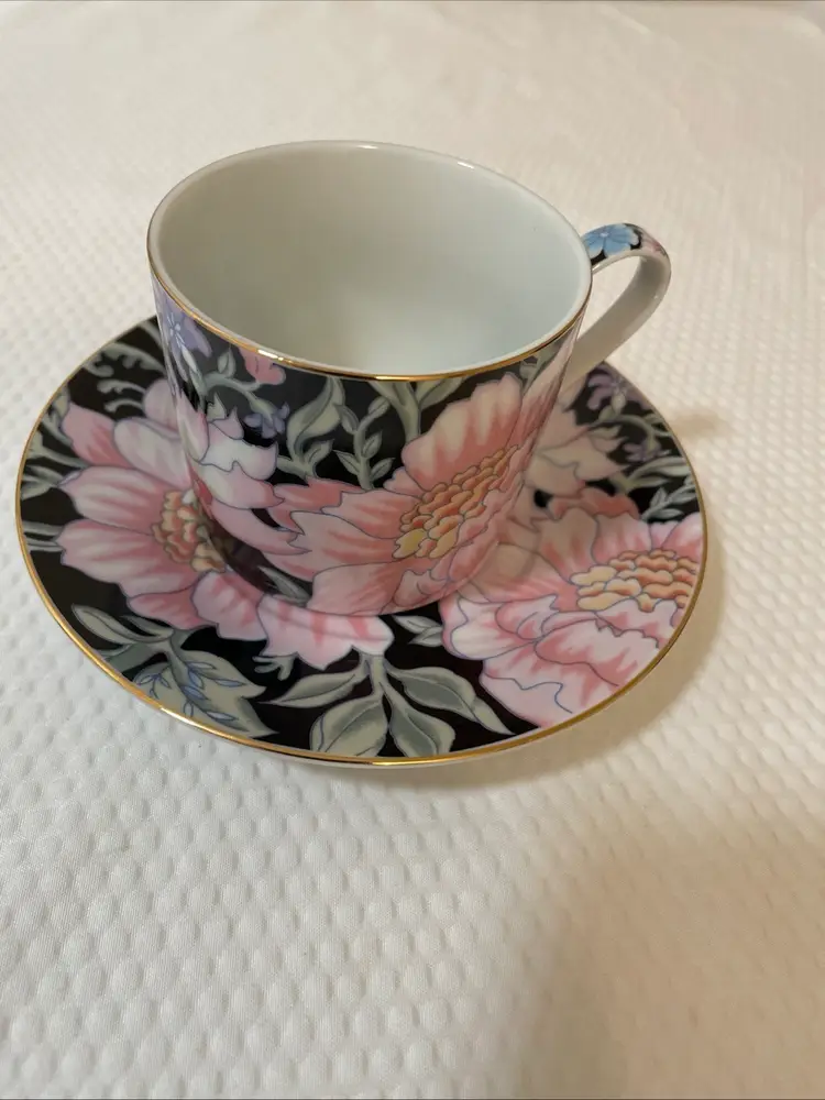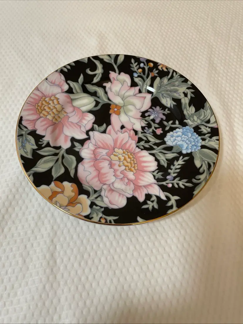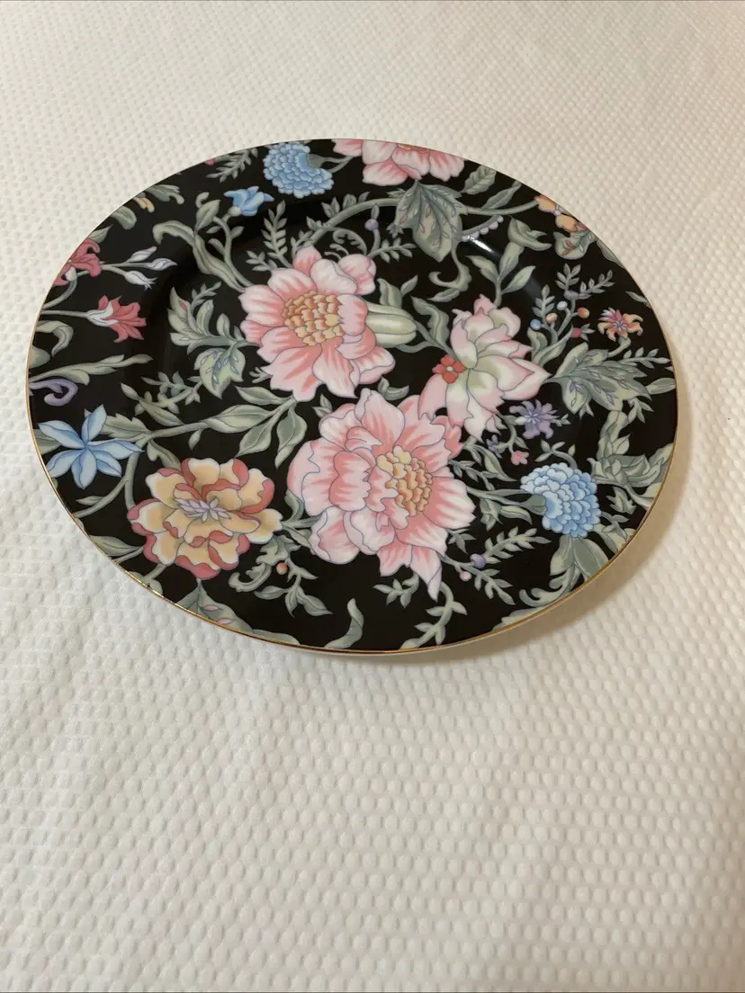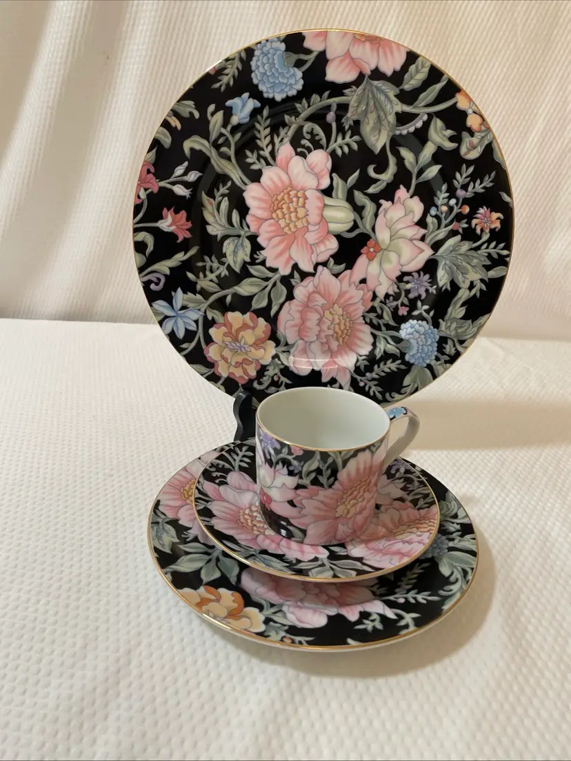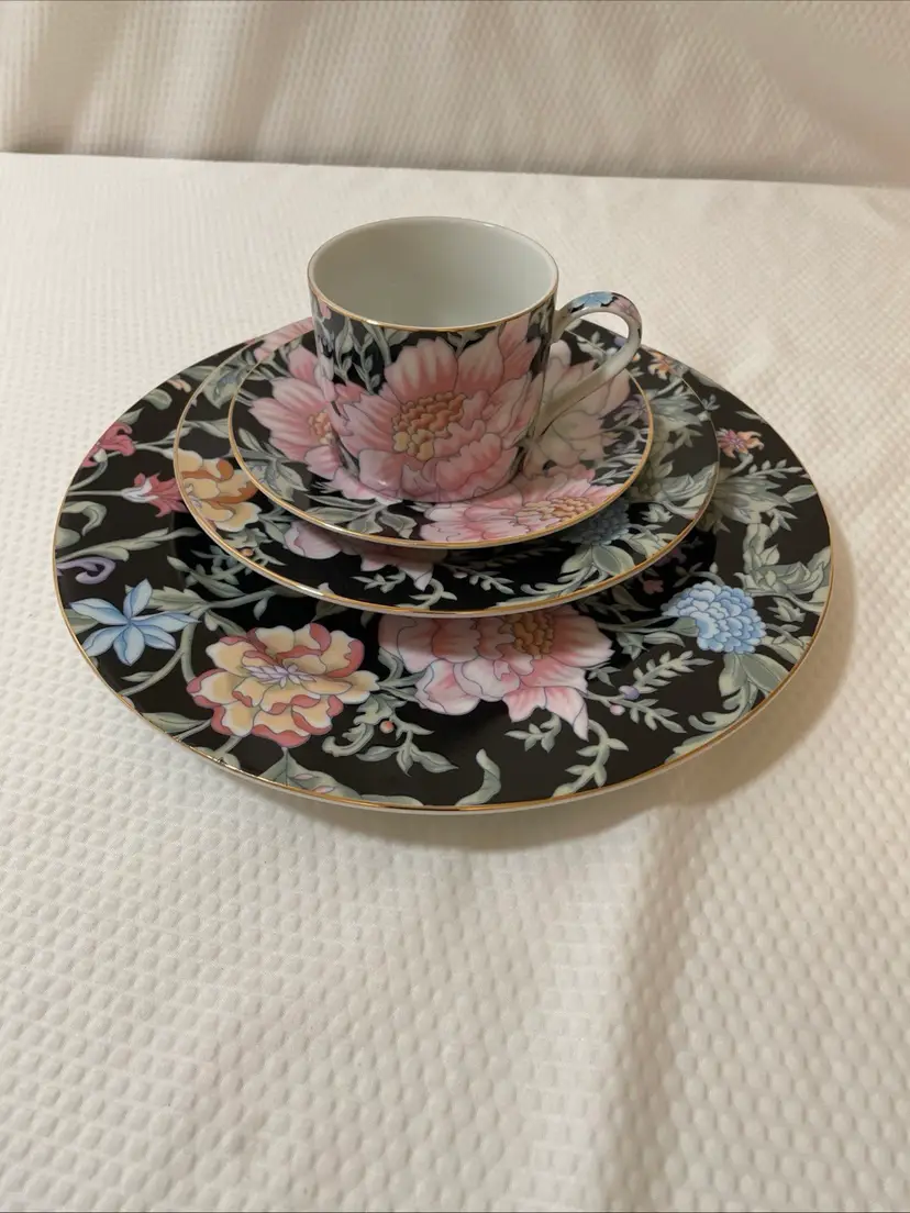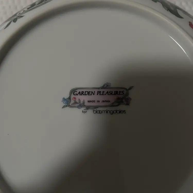 This is a set of “Garden Pleasures” porcelain dinnerware, featuring a dinner plates, salad plate, saucer and teacup. This pattern was made in Japan exclusively for Bloomingdales.