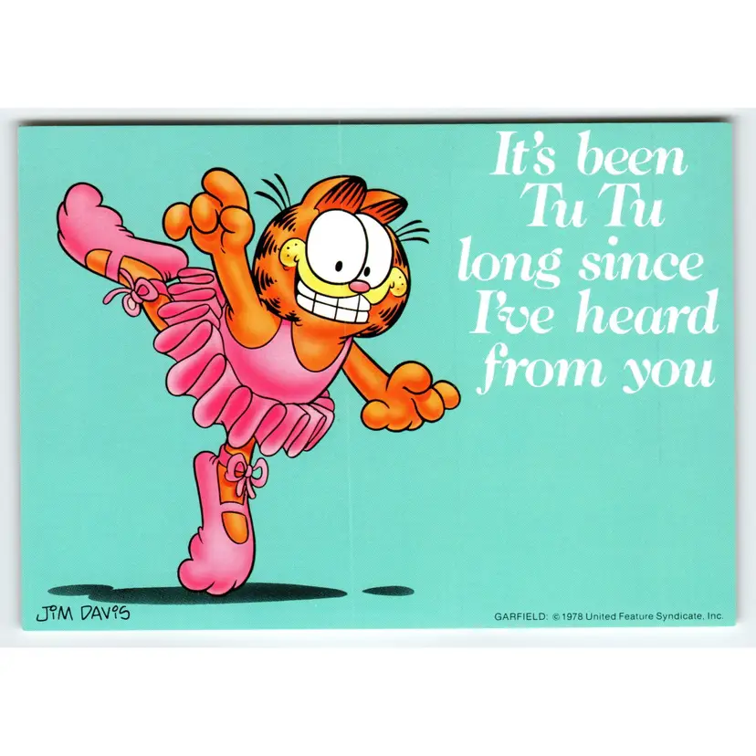 This postcard features everyone's favorite orange and black feline, Garfield the Cat, in a ballet tutu. Created by artist Jim Davis in 1978, this original lithograph print showcases Garfield's playful and humorous personality. The postcard is in excellent condition and has not been used or posted. The postcard measures 6 x 4 inches and is printed on high-quality paper. It is a perfect addition to any Garfield or cat lovers' collection and can be framed or displayed as is. Don't miss out on the chance to own this unique piece of Garfield memorabilia.
