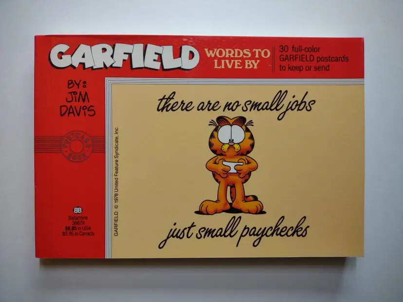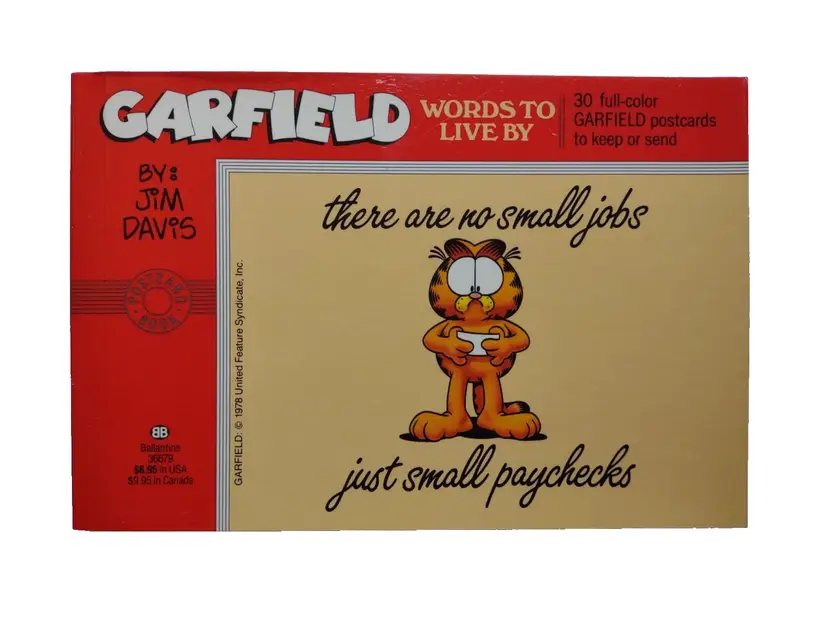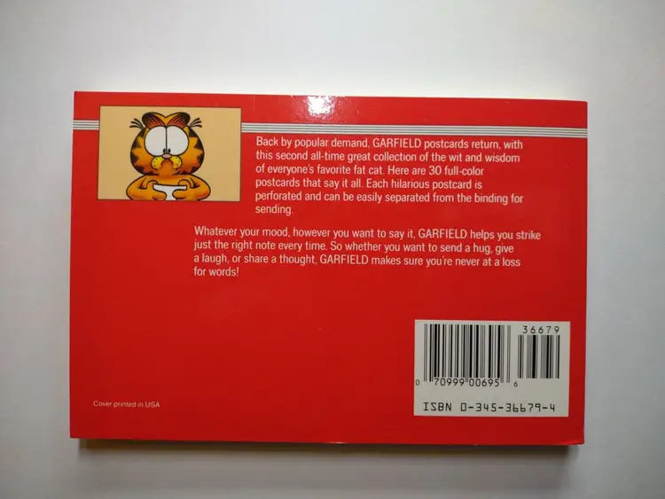 Book Series: Garfield Original Language: English Vintage: Yes Personalize: No Personalized: No Features: Illustrated Signed: No Ex Libris: No Narrative Type: Fiction Inscribed: No Edition: First Edition Type: Postcard Book Illustrator: Jim Davis Era: 1980s Country/Region of Manufacture: United States Book Title: Garfield Vol. 2 : Words to Live by Item Length: 4.7in. Item Width: 7.1in. Author: Jim Davis Format: Trade Paperback Language: English Topic: Form / Comic Strips & Cartoons, General Publisher: Random House Publishing Group Publication Year: 1990 Genre: Humor Item Weight: 4.8 Oz Number of Pages: 64 Pages