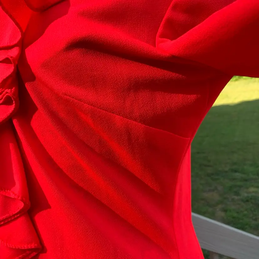 It does not say fabric, but I believe it is most likely a polyester. It is a light weight fabric, as you can faintly see your hand when you put it under the dress; definitely would have to wear a slip or something underneath.