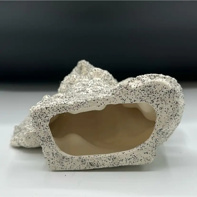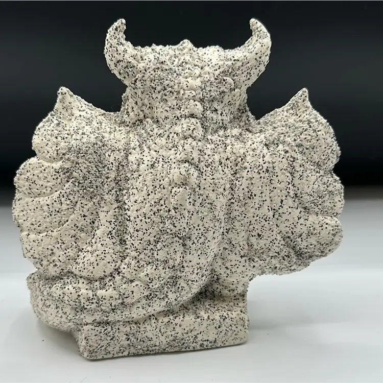 This gargoyle figurine has horns and a dragon tail. It is constructed of a lightweight clay. The finish is gritty. It measures 6” x 6”