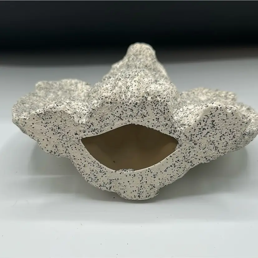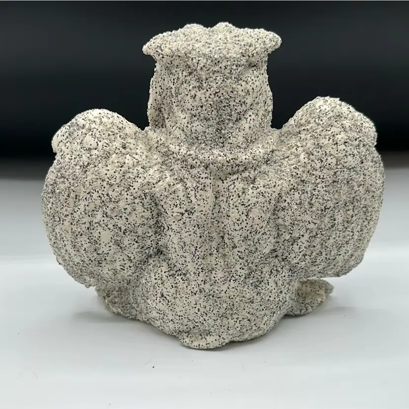 This figurine is constructed out of a lightweight clay. The finish is a gritty, frit-like finish