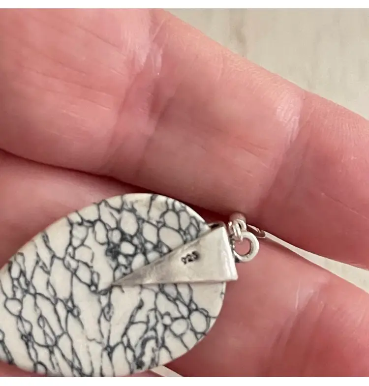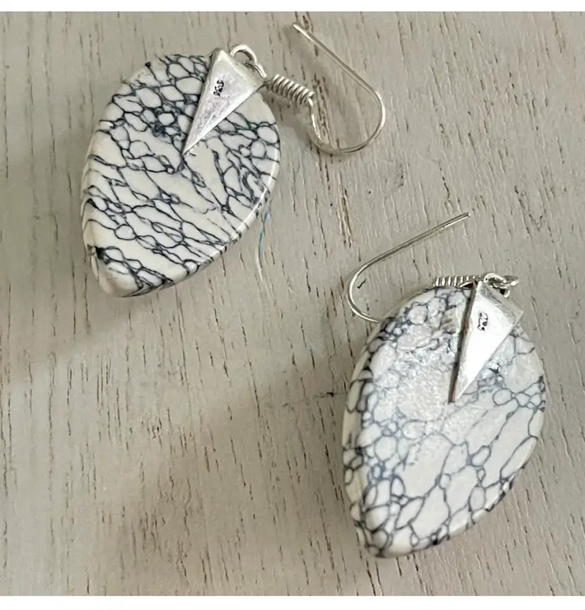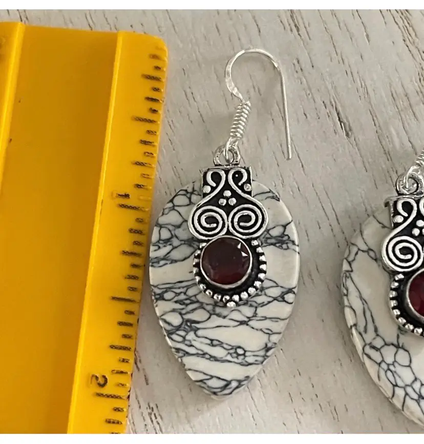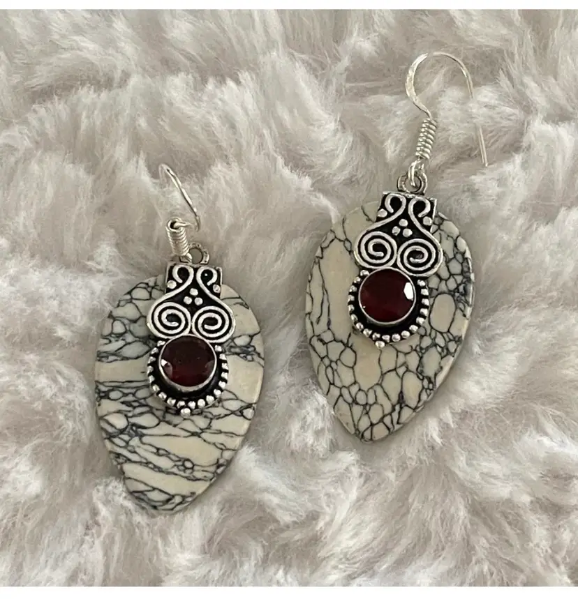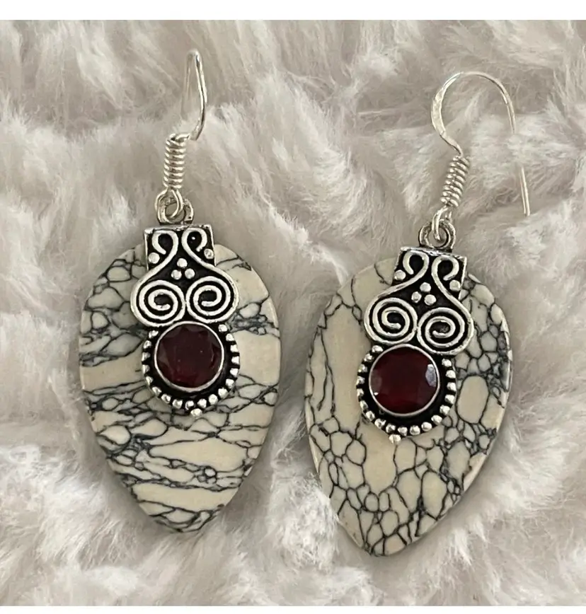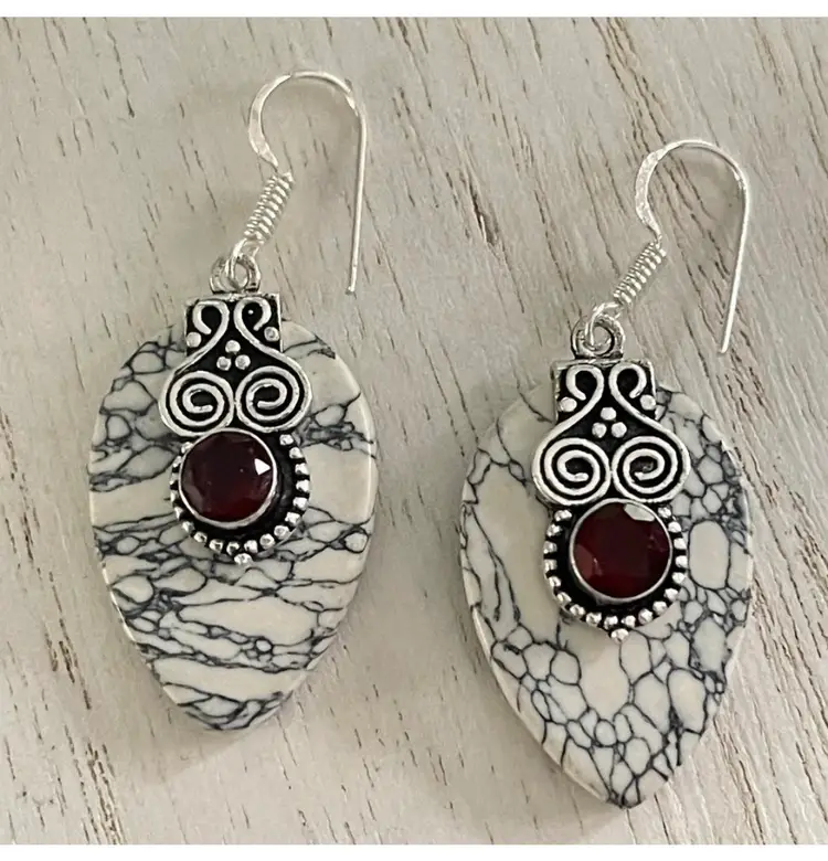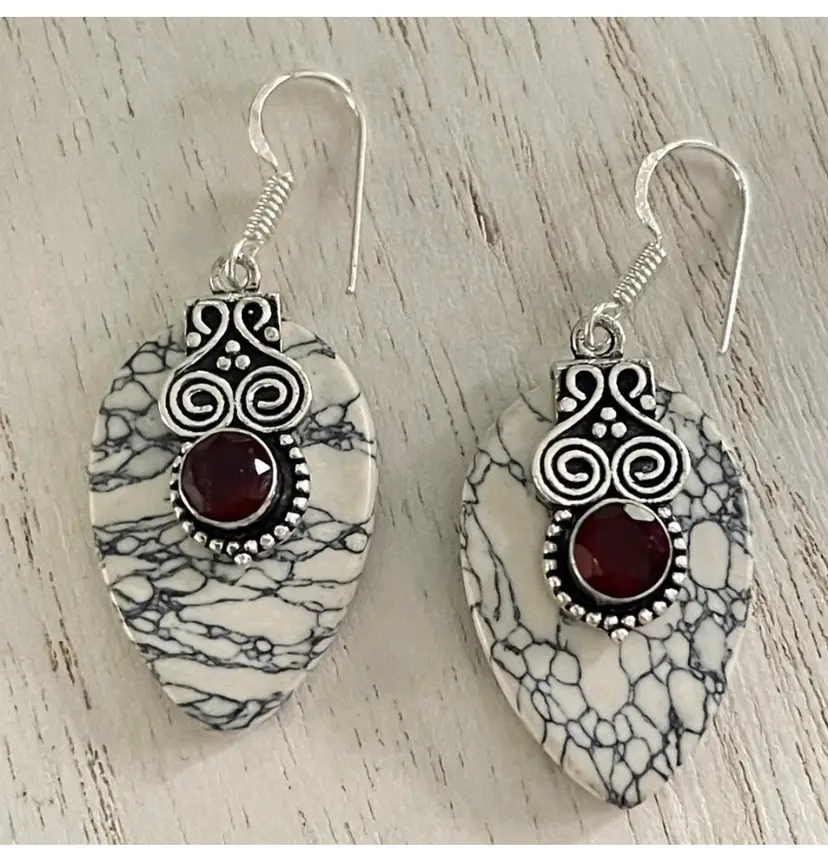 Garnet color cabochon and white howlite dangle earrings Approximately 2"