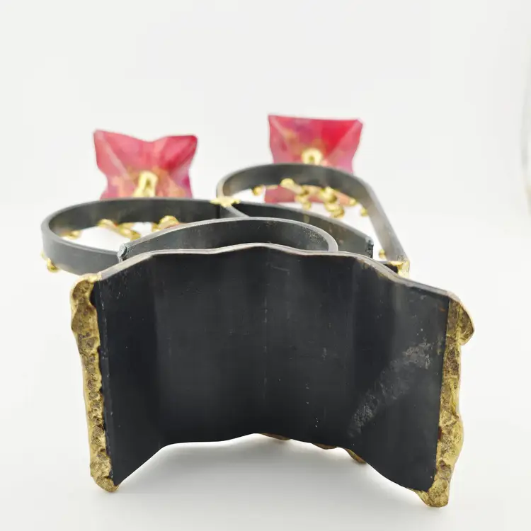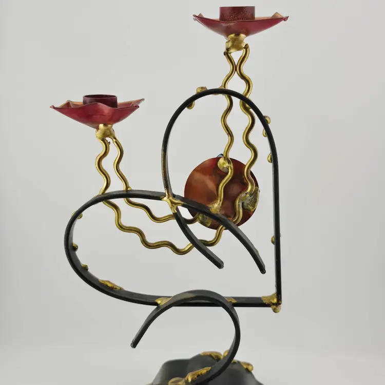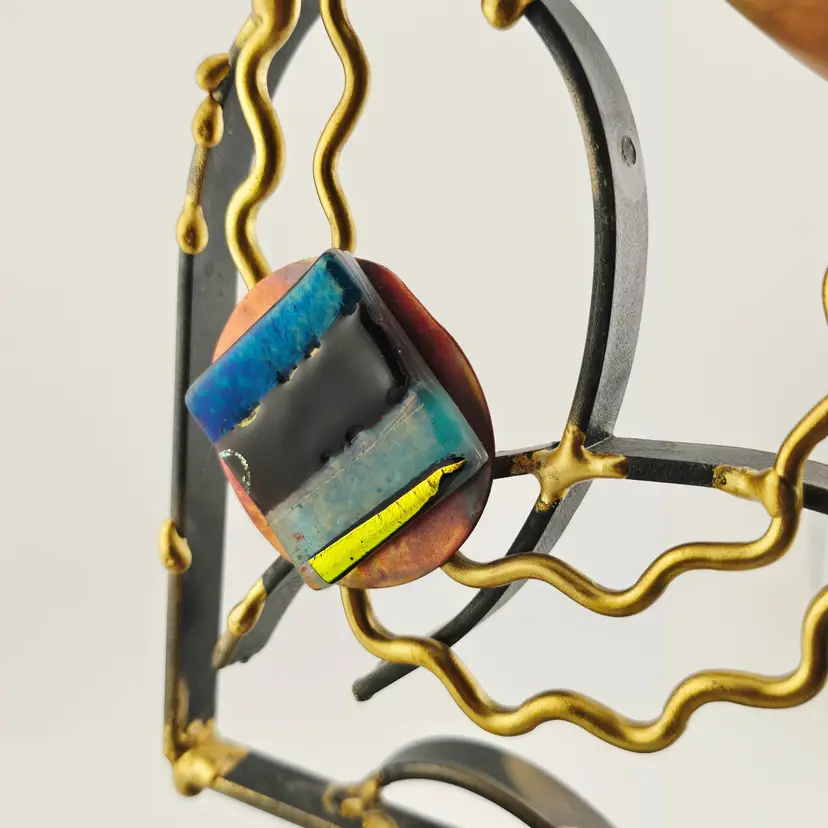 Good condition! Combining copper, brass, and steel with brilliant fused glass. 10.5 inches tall about 6 inches wide.