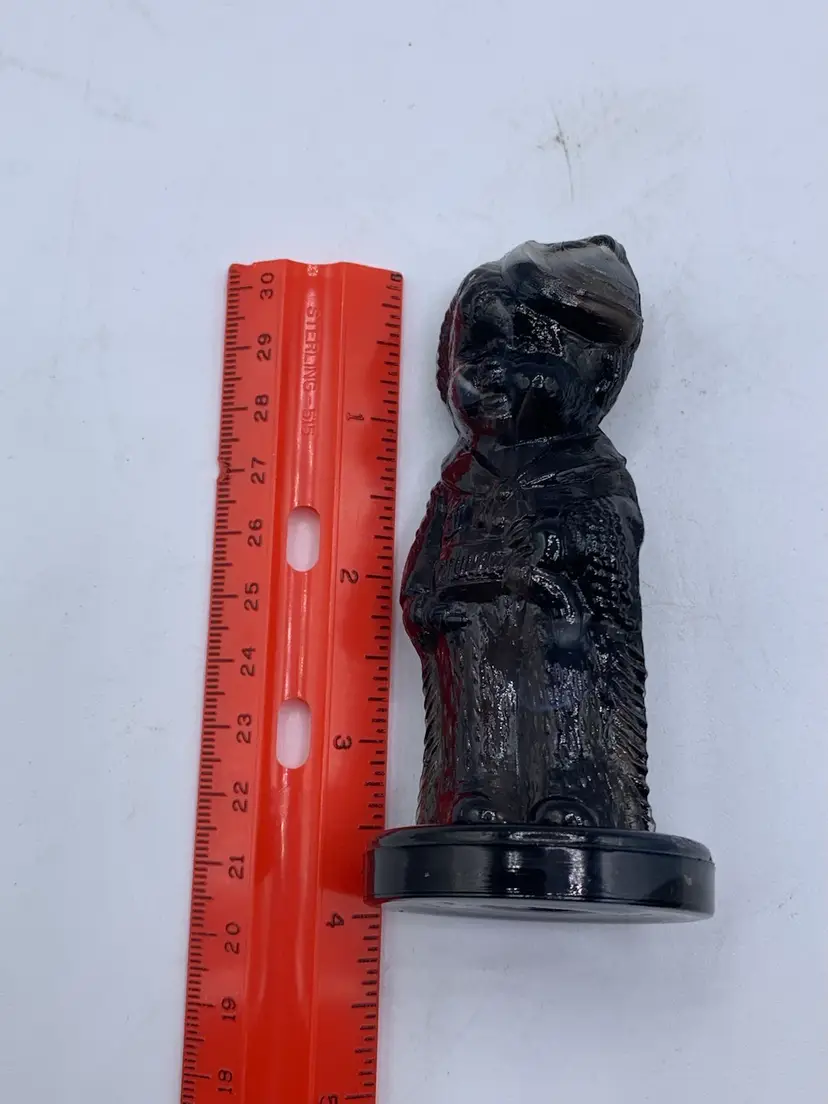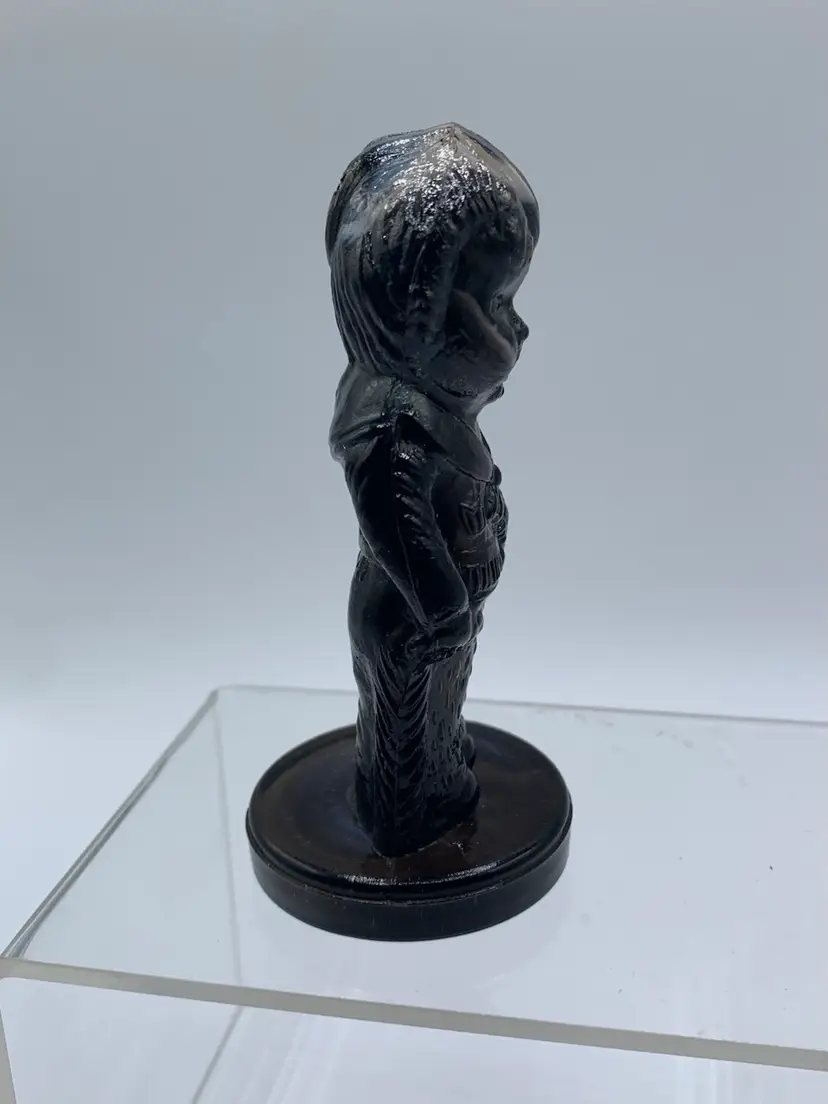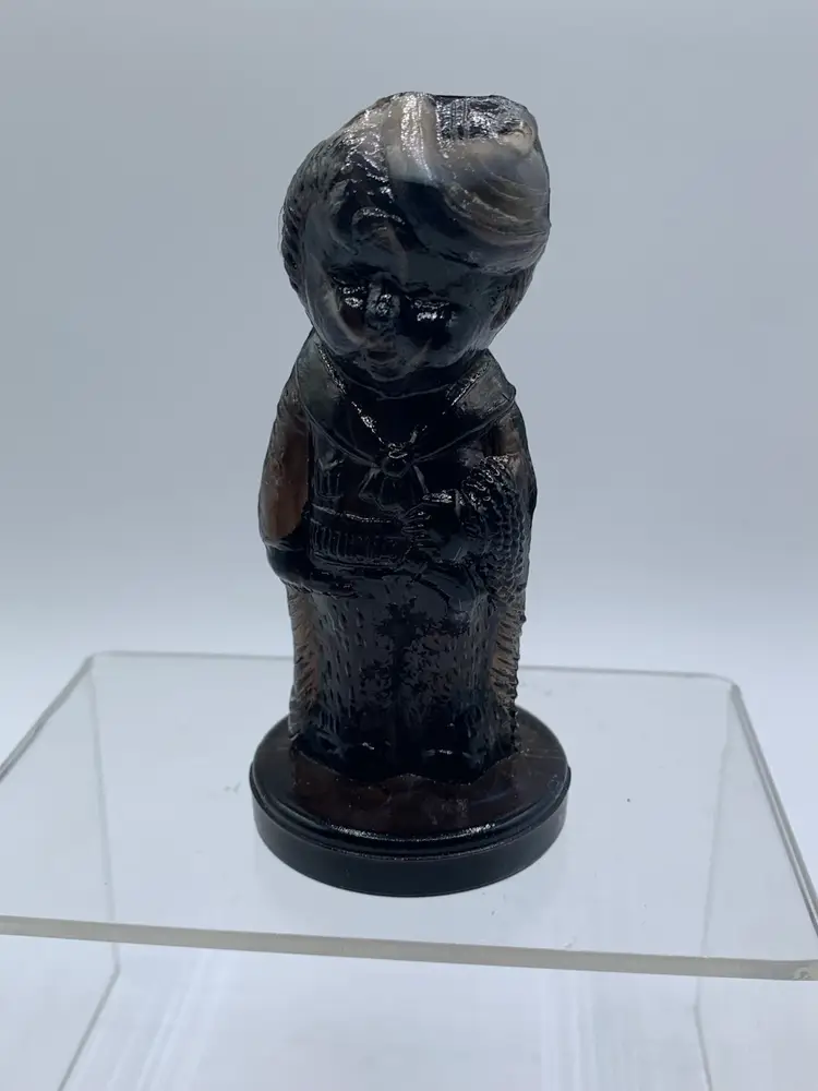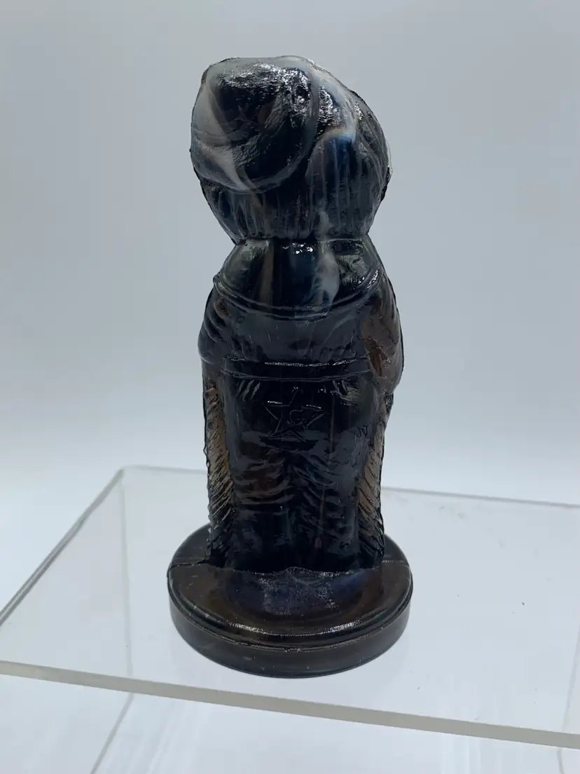 The Gaskill's Lil Buckaroo Cowboy figure is a rare vintage piece made of purple amethyst slag glass. This small decorative collectible features intricate details and vibrant colors that make it a unique addition to any collection. The use of slag glass adds a special touch to this piece, giving it a distinct and eye-catching quality that sets it apart from other items in its category.