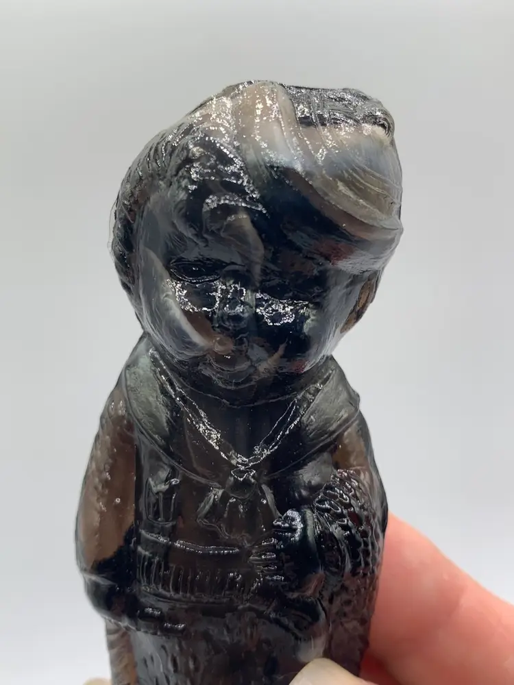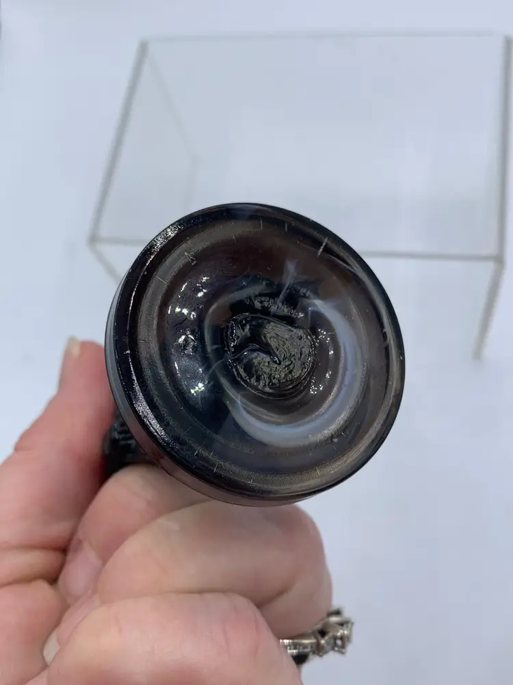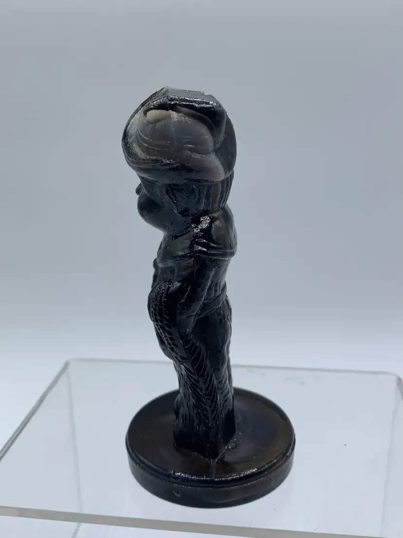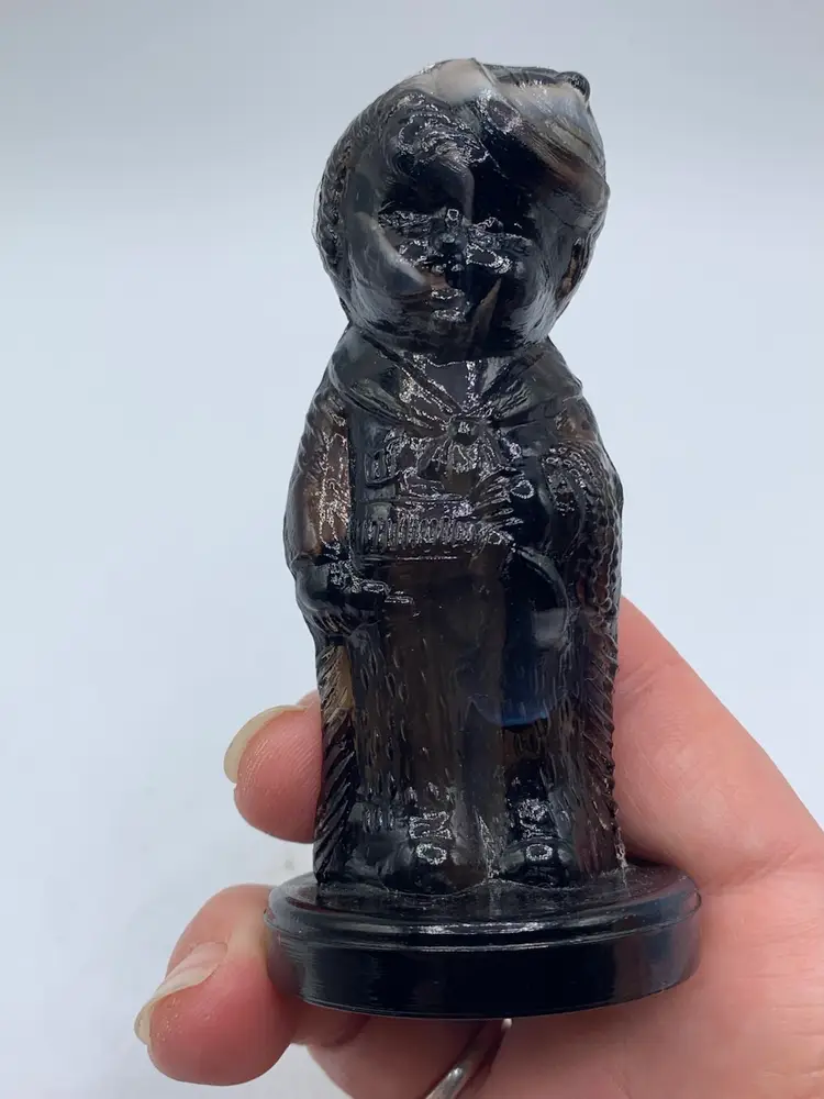 The Gaskill's Lil Buckaroo Cowboy figure is a rare vintage piece made of purple amethyst slag glass. This small decorative collectible features intricate details and vibrant colors that make it a unique addition to any collection. The use of slag glass adds a special touch to this piece, giving it a distinct and eye-catching quality that sets it apart from other items in its category.