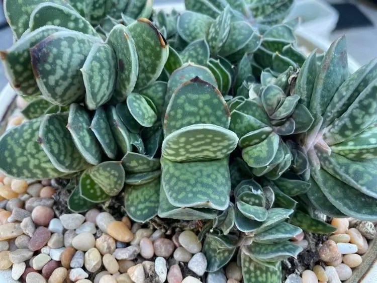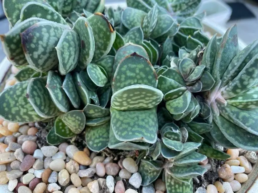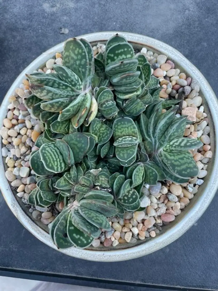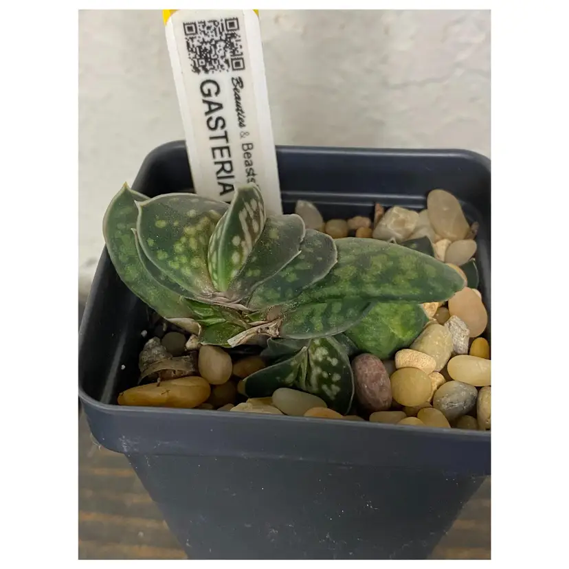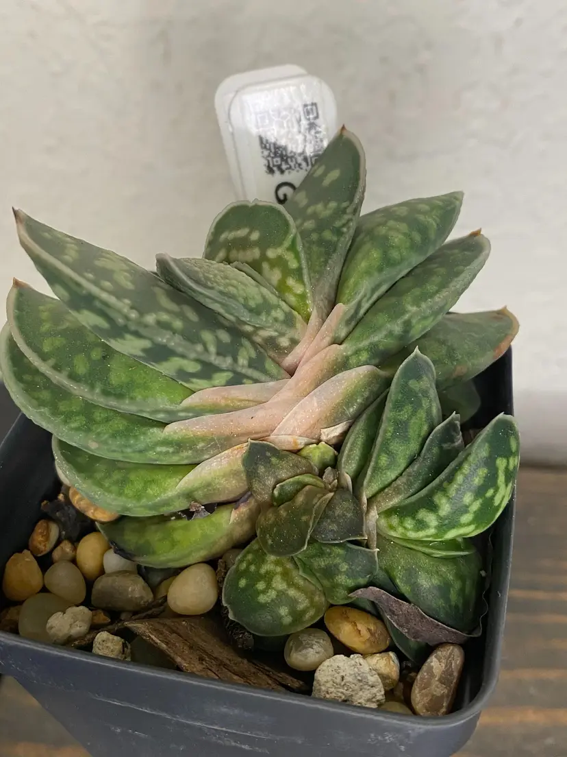 Gasteria minima is a believed to be a species endemic of Natal (South Africa) also know as Gasteria gracilis. Minima has basal leaves that are fleshy, thick, anceolate, to pillowy, tongue-like. Smooth, shiny, green speckled, wide with white dots and variably striped with yellow. Leaves may turn red if plant is stressed. Flowers are small up to 2 cm, pendulous, tubular, bicoloured reddish-pink and green that look like little stomachs(typical gasteria flowers shape) . The inflorescence can be branched and tall. Flowers can be produced any time of year, peaking in midwinter to spring.