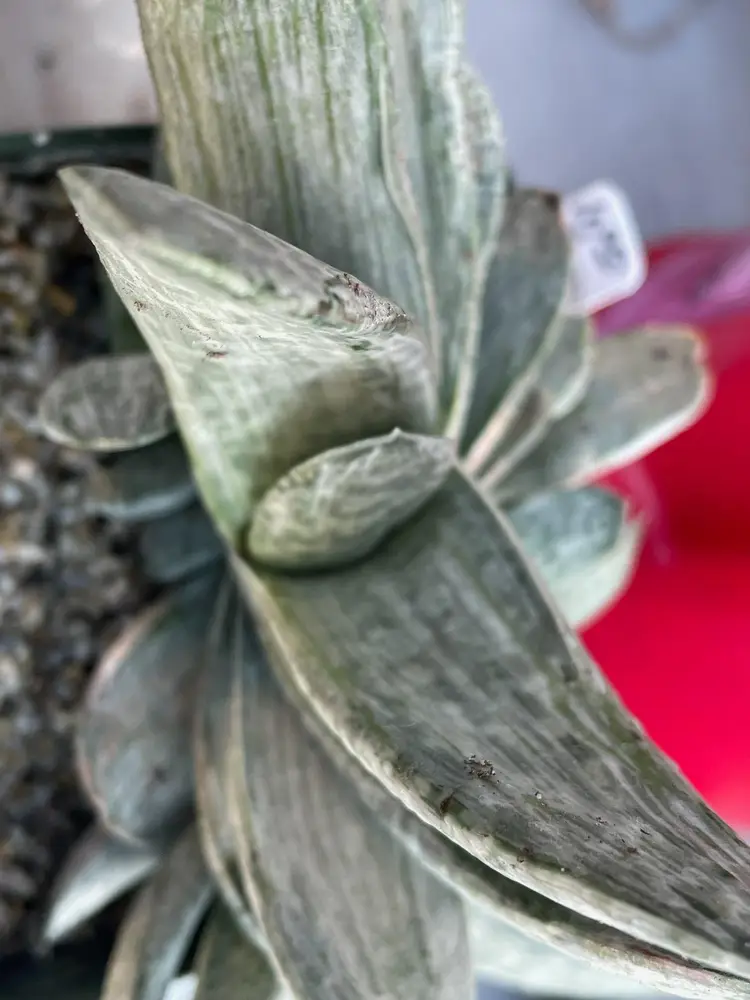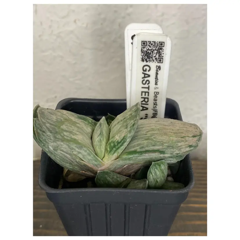 Gasteria 'Sakura Fuji' is an attractive hybrid succulent of unknown parentage believed to be of Japanese origin. It is a very attractive fast growing succulent. The leaves are tightly bunched, white and grey reaching up to 6" long. The tips have ridges that give it almost a monstrose look. This plant will freely offset to form a clump. It requires light shade, when exposed to a bit more sun it will get a light pink hue on the leaves. Keep mostly dry during dormancy.