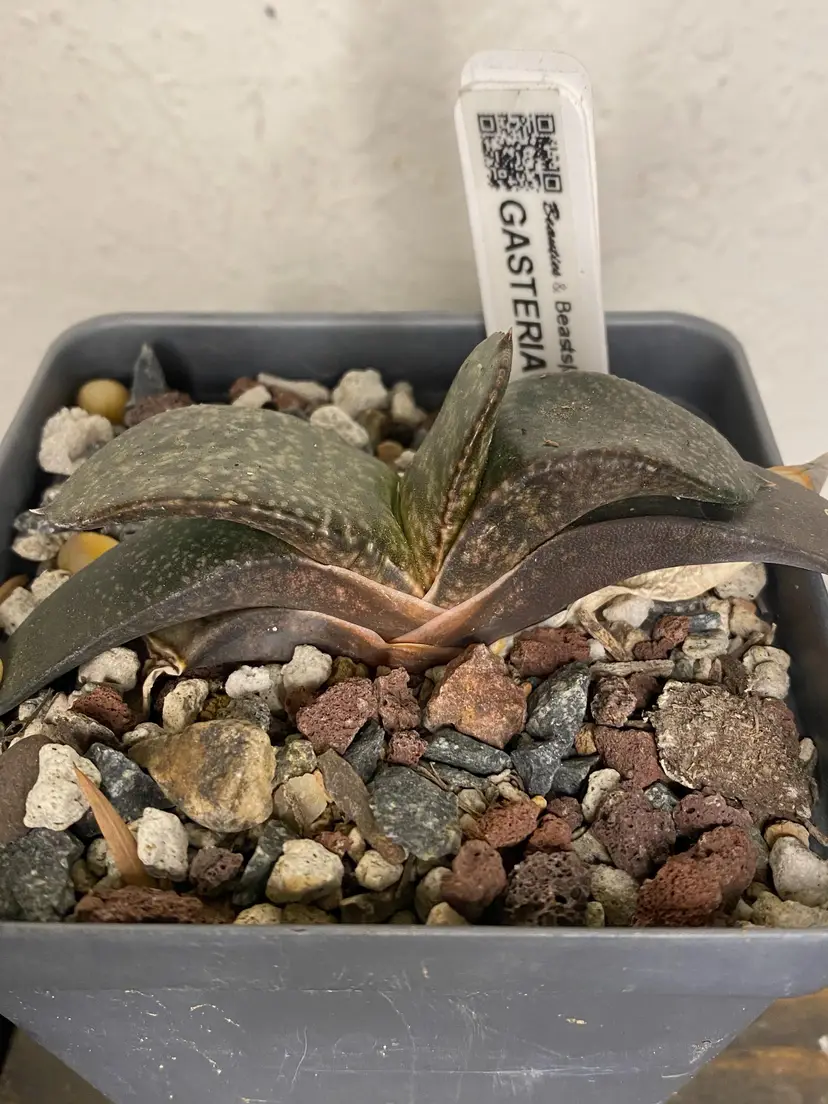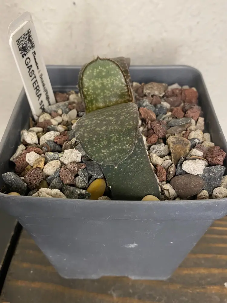 The leaves of Gasteria plants are thick, fleshy, and rosette-shaped, and come in a variety of green shades with patterns and textures such as spots or stripes. The flowers of Gasteria plants produce beautiful tubular flowers ranging from red to green that bloom on tall stalks and add a lovely touch to their overall appearance. These low-maintenance Gasteria plants have a clumping growth habit, producing offsets, or "pups," around the main plant base, forming visually appealing clusters over time.