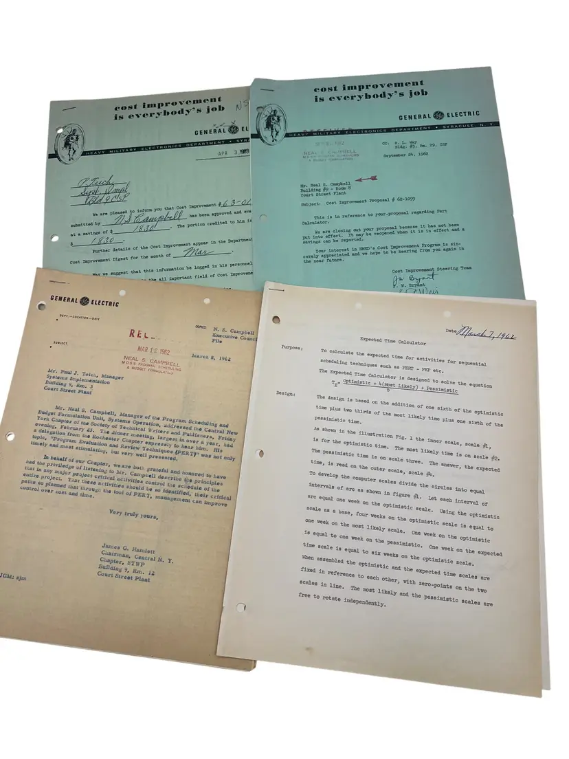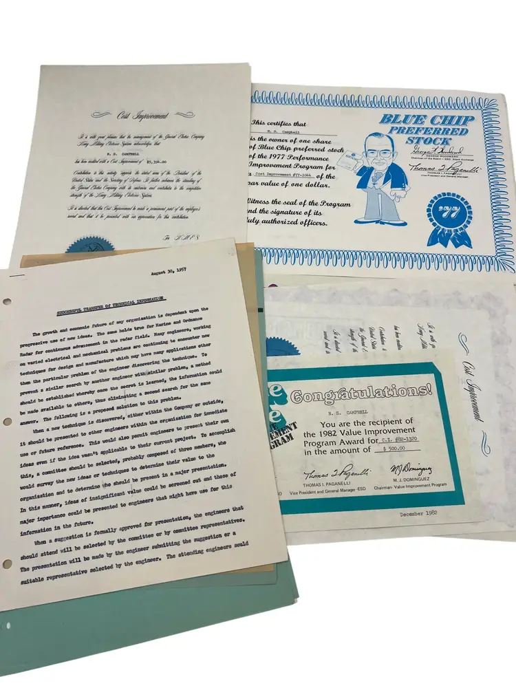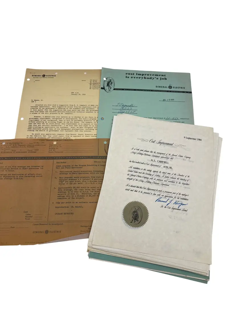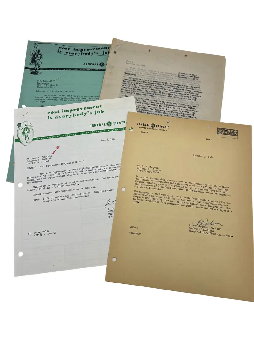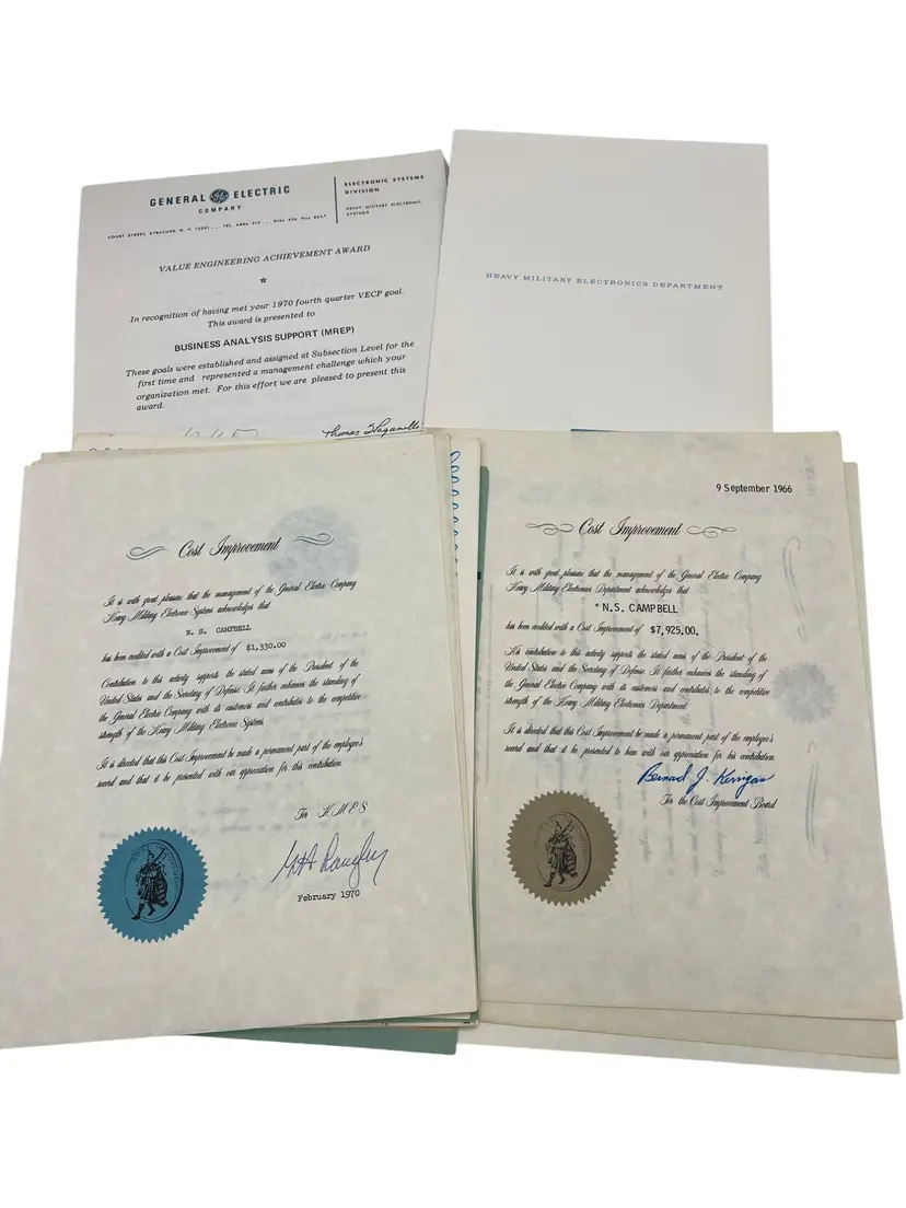 Large mixed lot of vintage General Electric internal documents from the Heavy Military Electronics Department and Defense Electronics Division in Syracuse, New York. Dates range from the mid-1950s through the early 1980s and include cost-improvement proposals, correspondence, award notifications, technical memos, and formal certificates issued to employee N. S. Campbell. Several embossed GE award certificates are included, along with VECP and Value Improvement Program documents. Many pages are typed originals or carbon copies, some hole-punched as originally stored in plant binders. A substantial archival collection representing GE’s Cold War–era cost-reduction programs, engineering processes, and internal recognition systems.