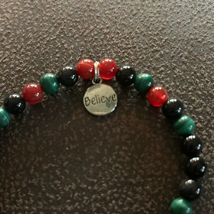 Gemstone Beaded Bracelet With “Believe” Metallic Disc. 3 1/2” diameter fits 7” - 7 1/2” wrist. Pretty in the matching repeating pattern.