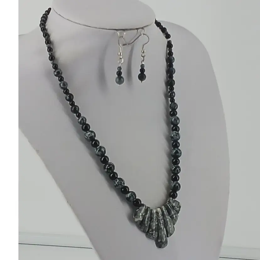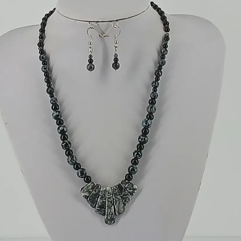 A Bib of Chinese Writing Stone Gemstones is front and center and measures approx. from seven stones from smallest to largest stones, Qty 2 – 5/16 x 9/16 x ¼ inch – Qty 2 – 3/8 x ¾ x ¼ inches – Qty 2 – 3/8 x 1 x ¼ inches and One – 3/8 x 1 1/8 x 1/8 inches with 5/16 and ¼ and 1/16 inch Chinese Writing Stone Beads and with ¼ inch and 3/16 inch glass beads to make this 19 inch necklace with matching Chinese Writing Stone Gemstones and Black Glass Beaded earrings. Stainless Steel French Wires.