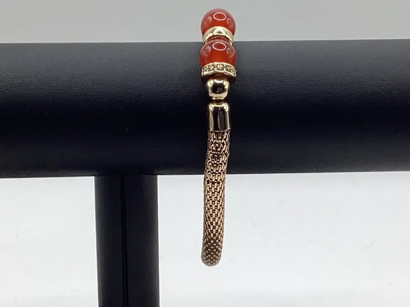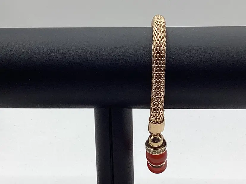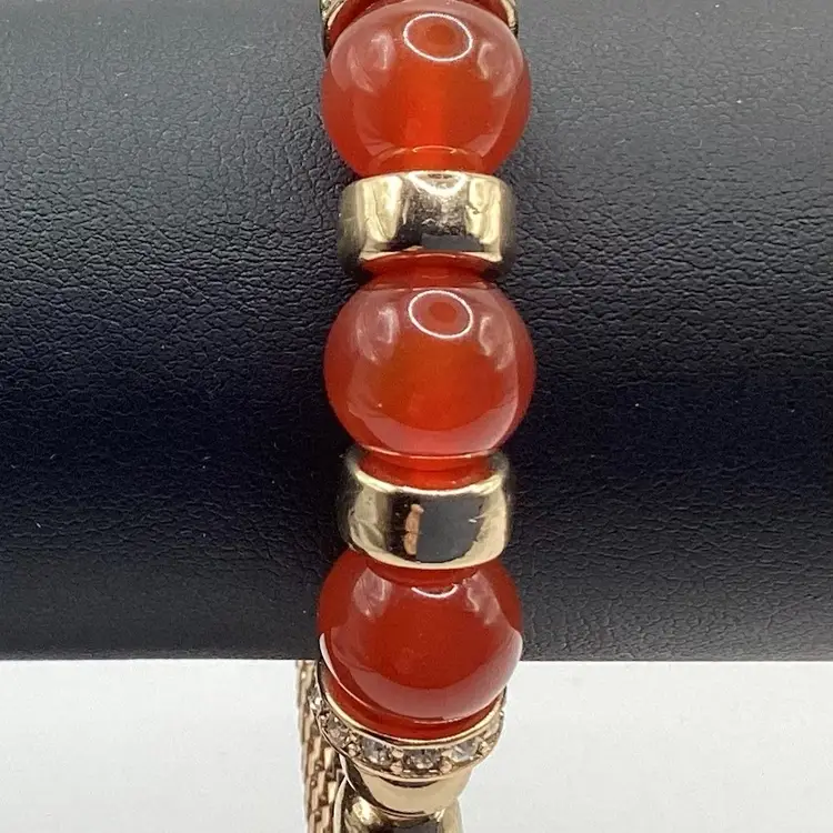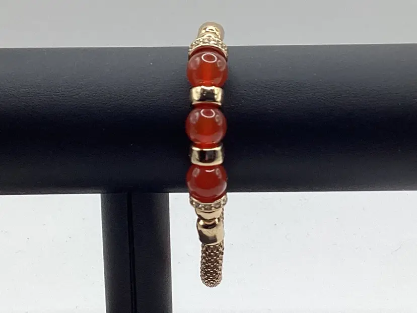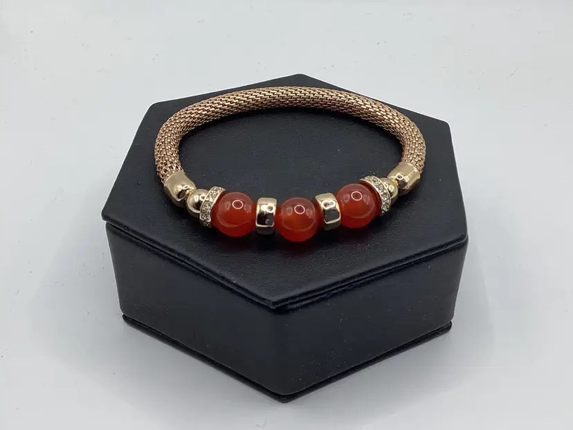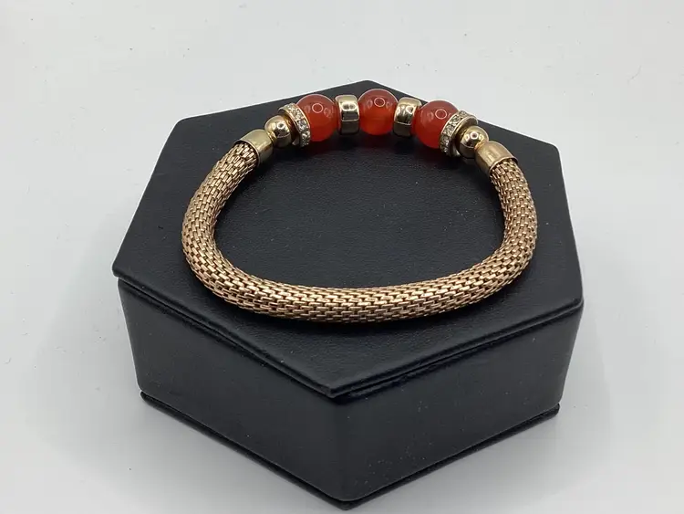 Identifier: None Features: 3 beads / Gold tone spacers / 2 spacers have rhinestones / Mesh band for easy on and off Material: Metal / Rhinestones tested/ Beads Color: Gold tone spacers / Rust colored beads / Clear rhinestones Measurements: Opening is 3 & 1/4”