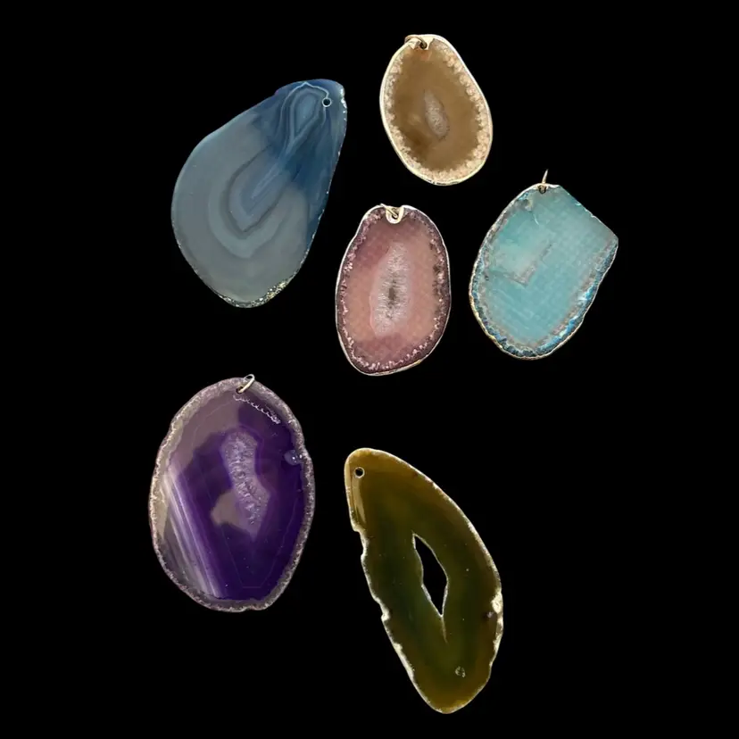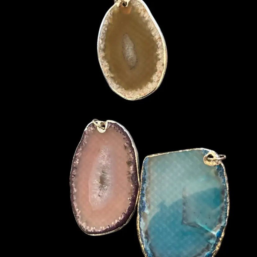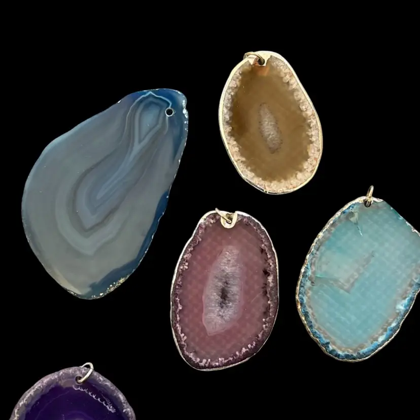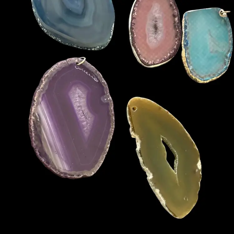 Gemstone slice pendants, as is. In good condition, in various stages of jewelry making. 2.5-4”