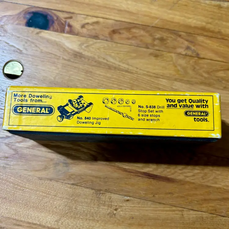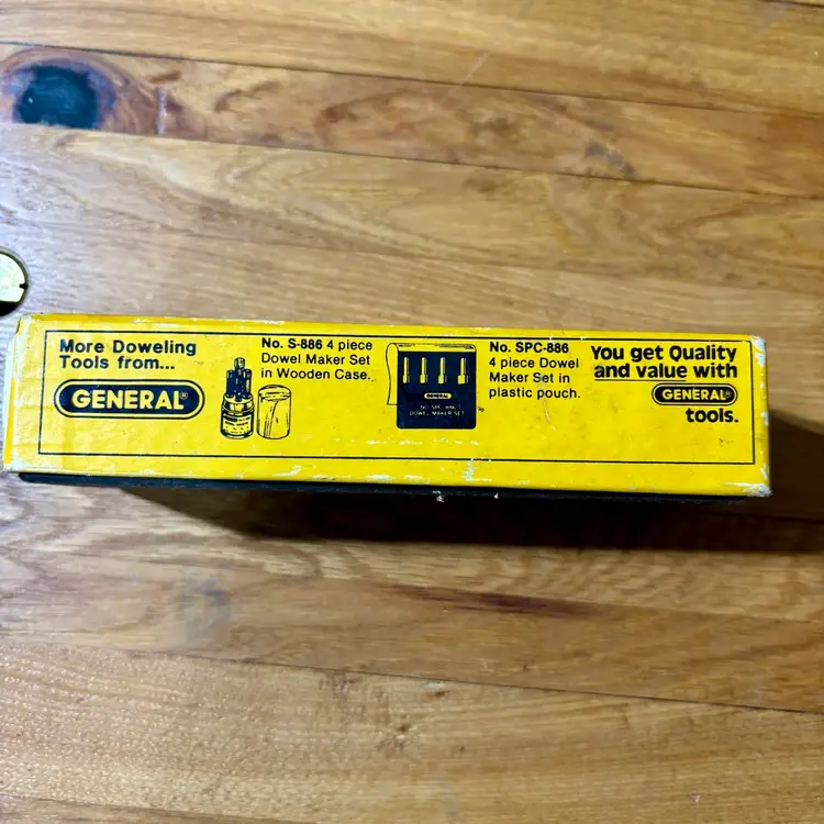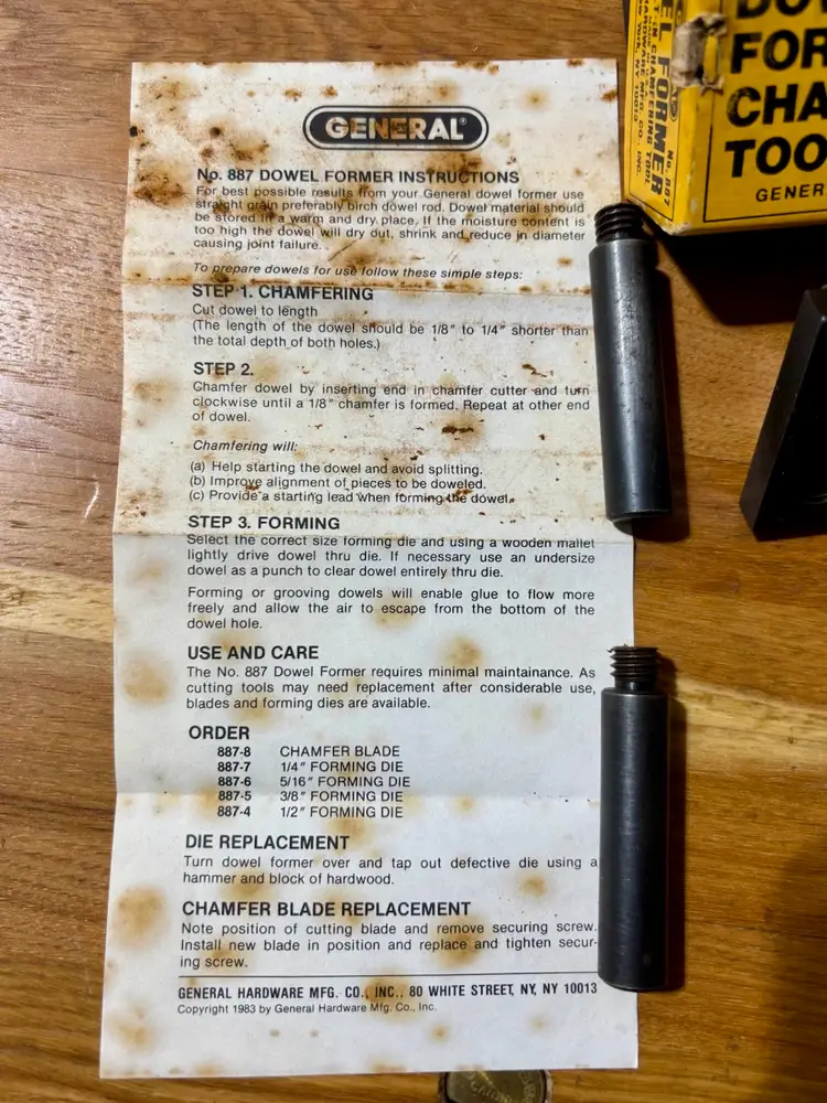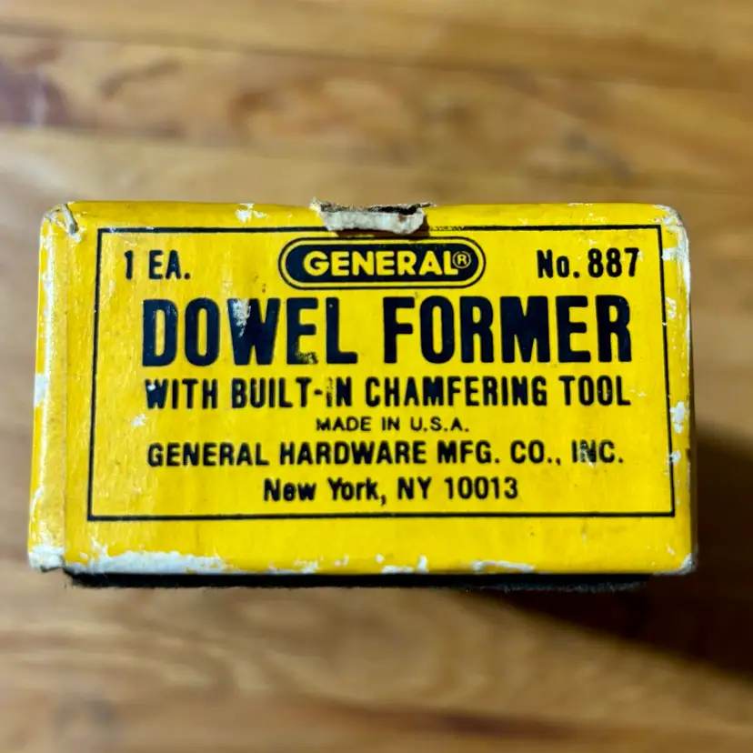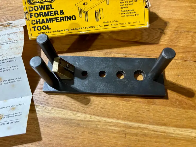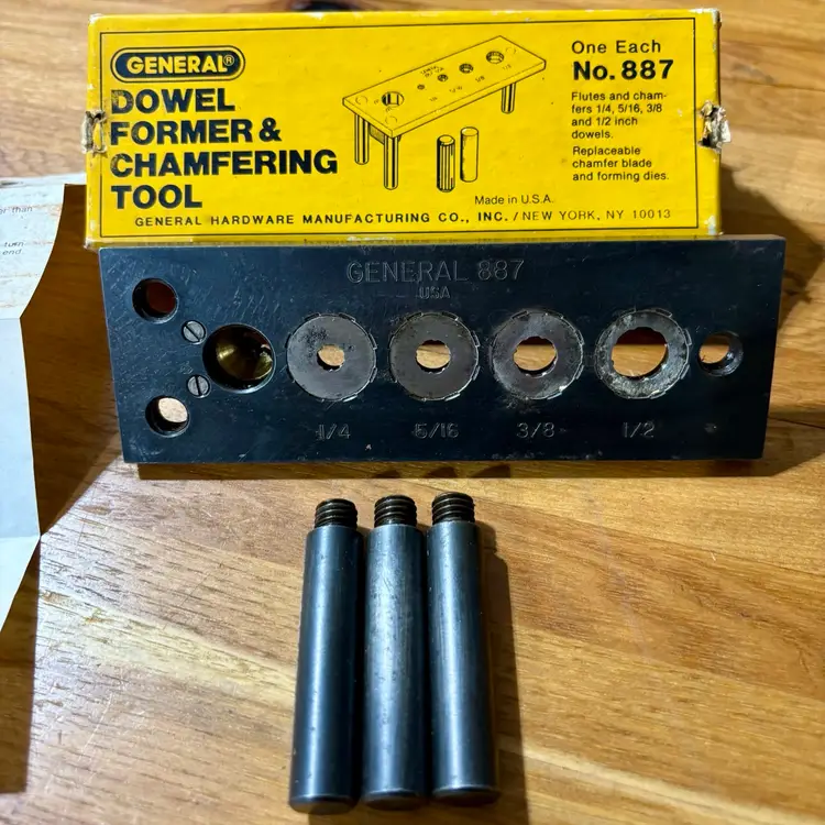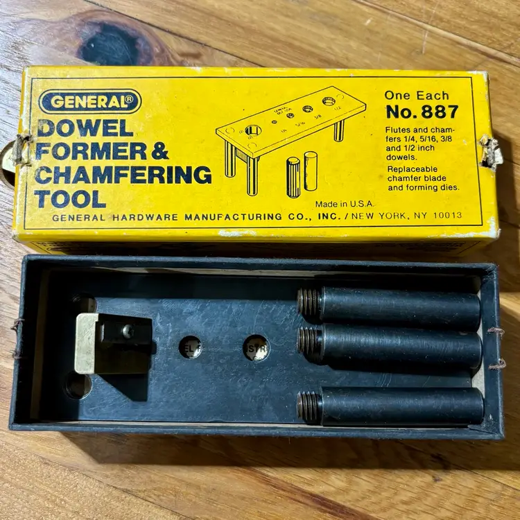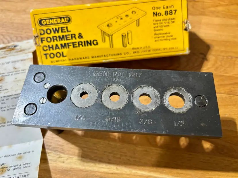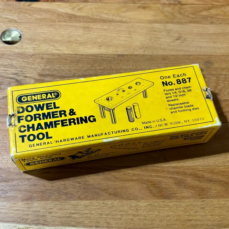 General No. 887 Dowel Former & Chamfering Tool in Box with Instructions. Jig makes fluted and chamfered 1/4, 5/16, 3/8, 1/2 dowels for woodworking joinery. Manufactured by General Hardware Manufacturing Co. in New York, NY.