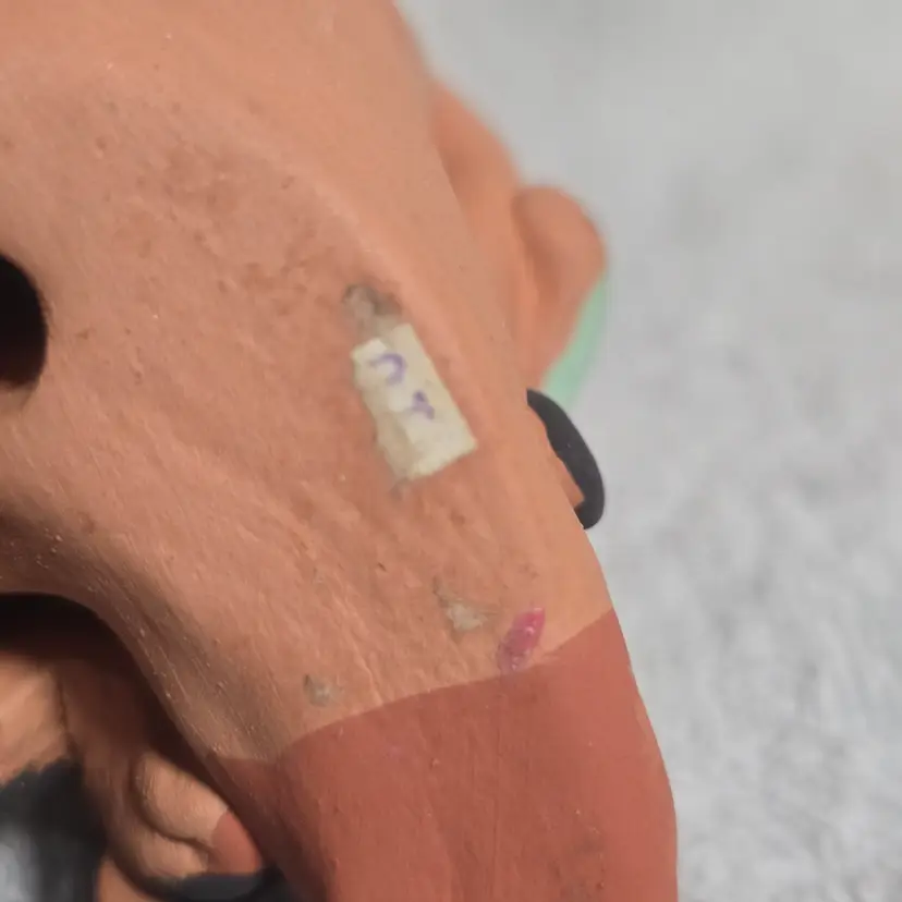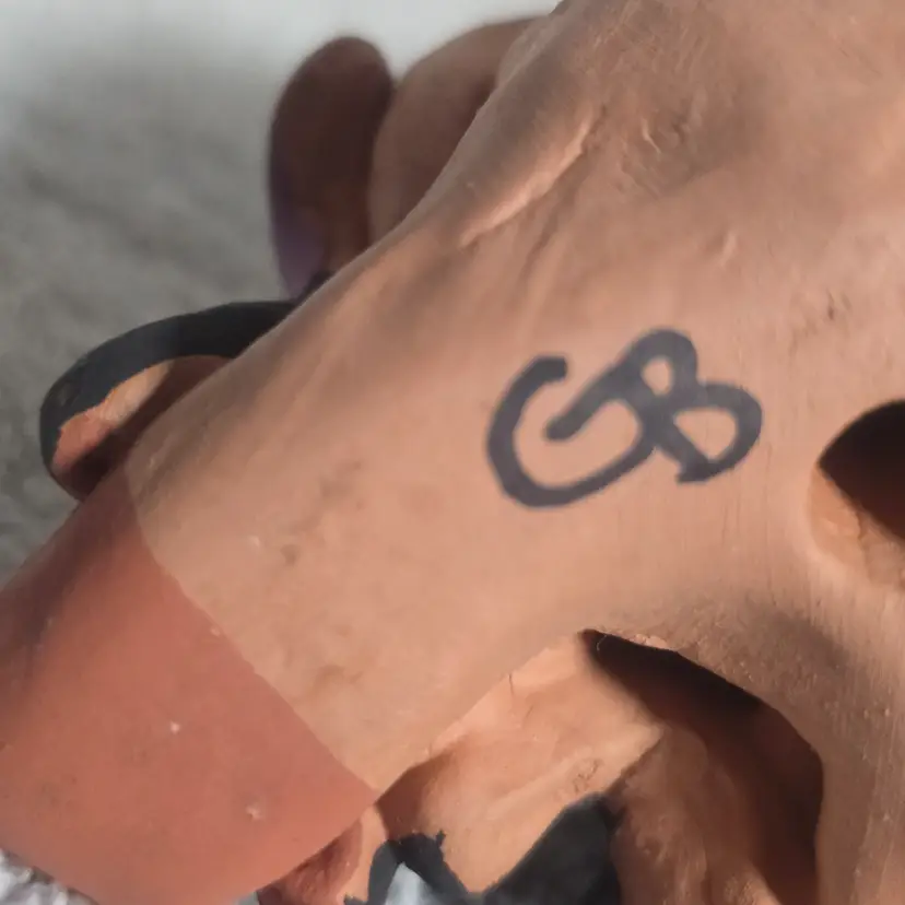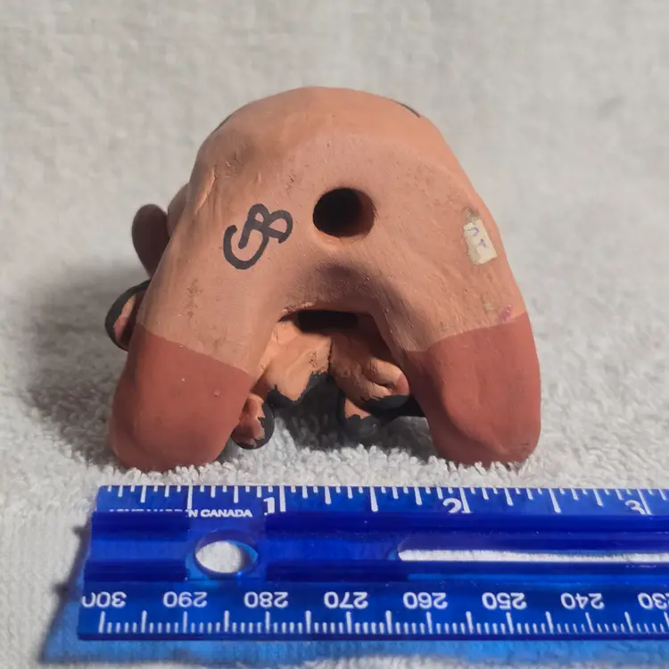The GB signature on bottom, marking on the back, along with the more minimal painted clothing decoration are characteristic of the artist’s earlier production style, which suggests dates to the 1980s, prior to later pieces that often show more detailed surface embellishment.