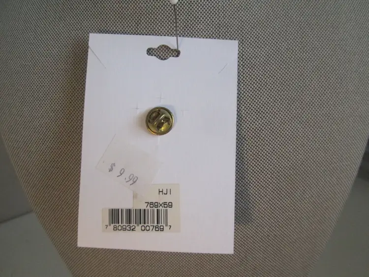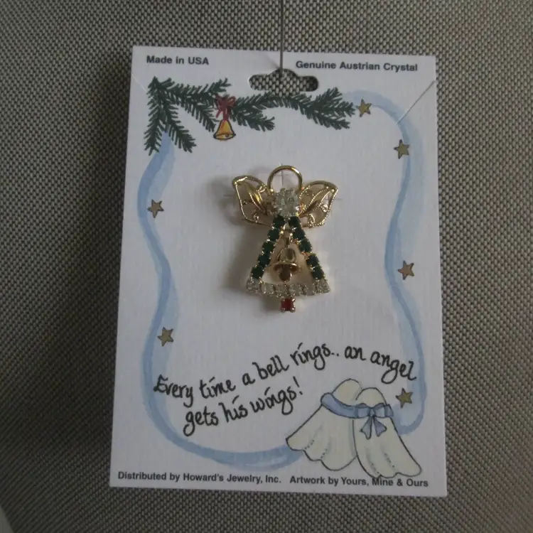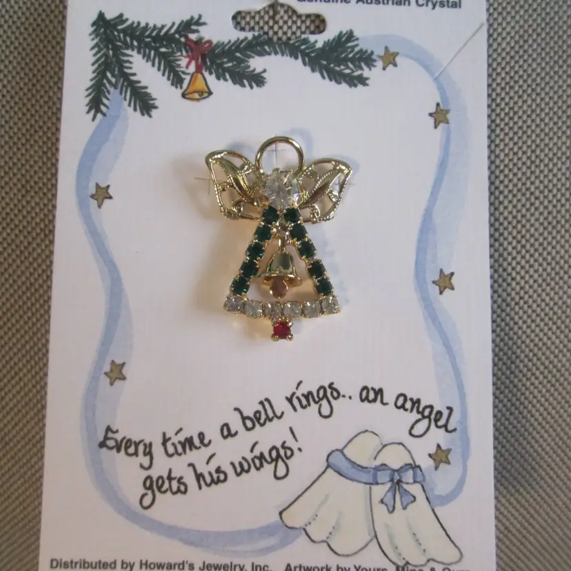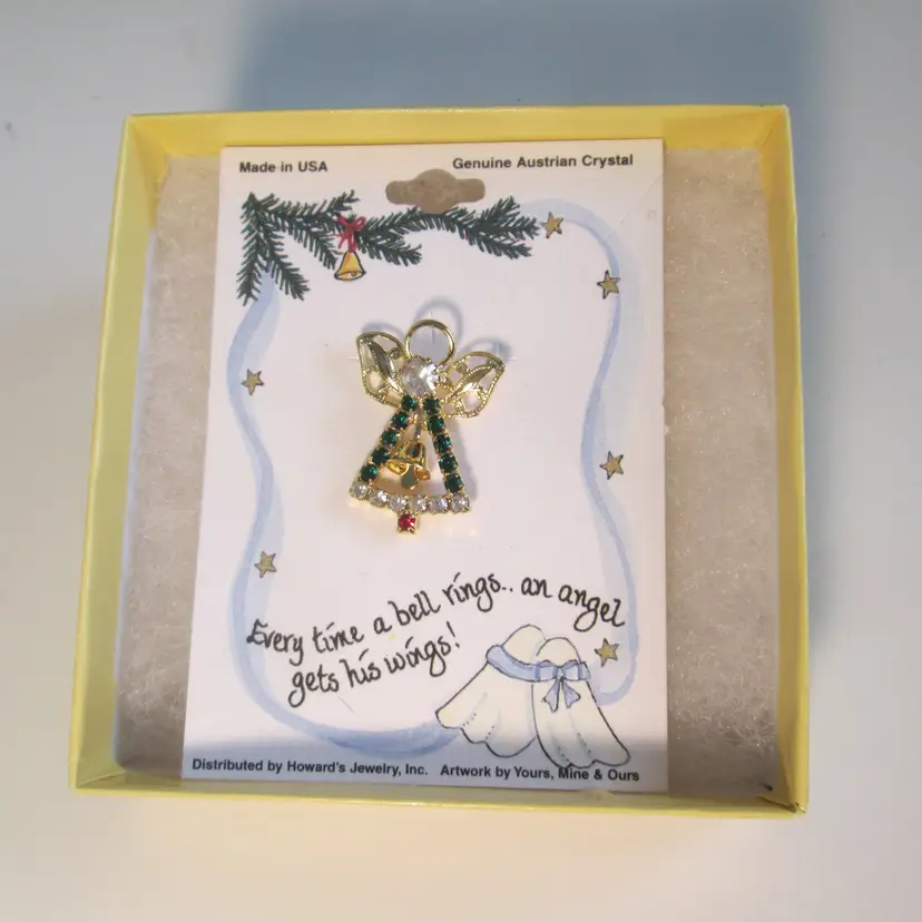 New old stock genuine Austrian Crystal studded gold angel pin with green and red crystals. The angel measures 7/8" x 1 1/4". Still attached on the original retail card. Howard's Jewelry, made in the USA.