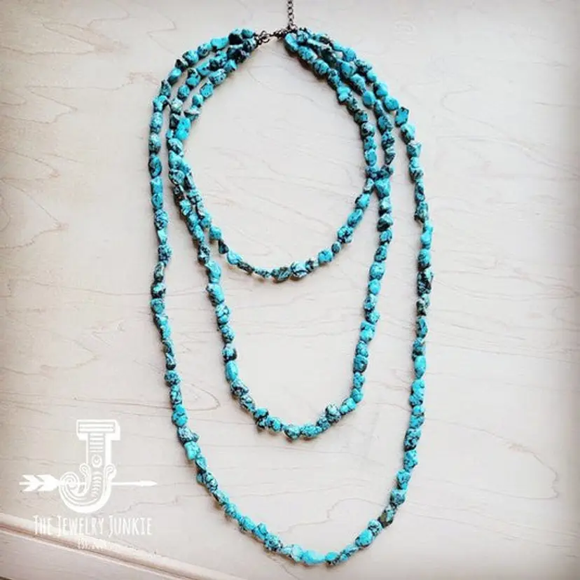Genuine Dyed Turquoise Gemstone Necklace Length: 18" 24" 30" with a 2" Extender Chain Stone size with vary in size from 1/8" up to 3/4" depending on what is available at the time your piece is made. Mix and match with our entire catalog of natural turquoise stones Clasp closure Made in the USA All pieces made by The Jewelry Junkie are handmade. While the piece that you receive will look similar to that in the image, there are no two pieces of jewelry that are identica
