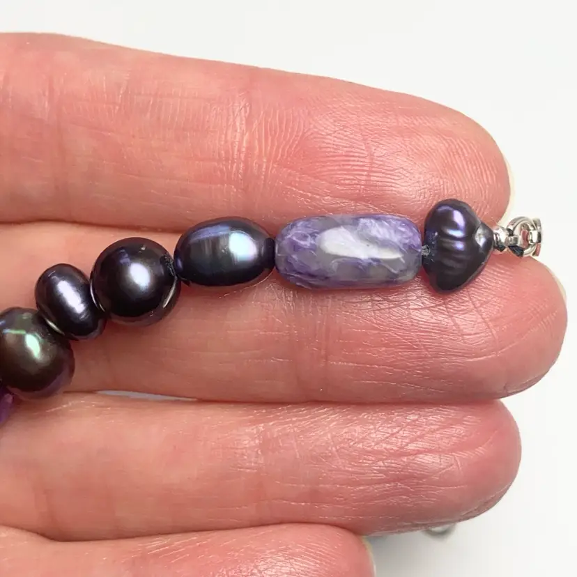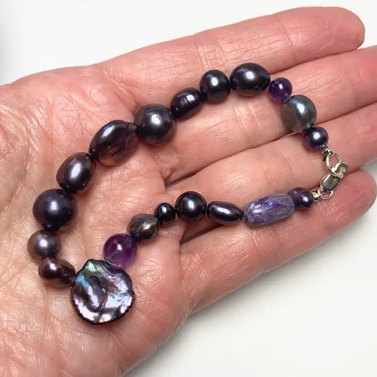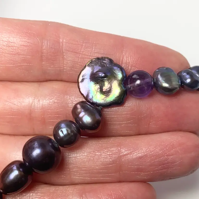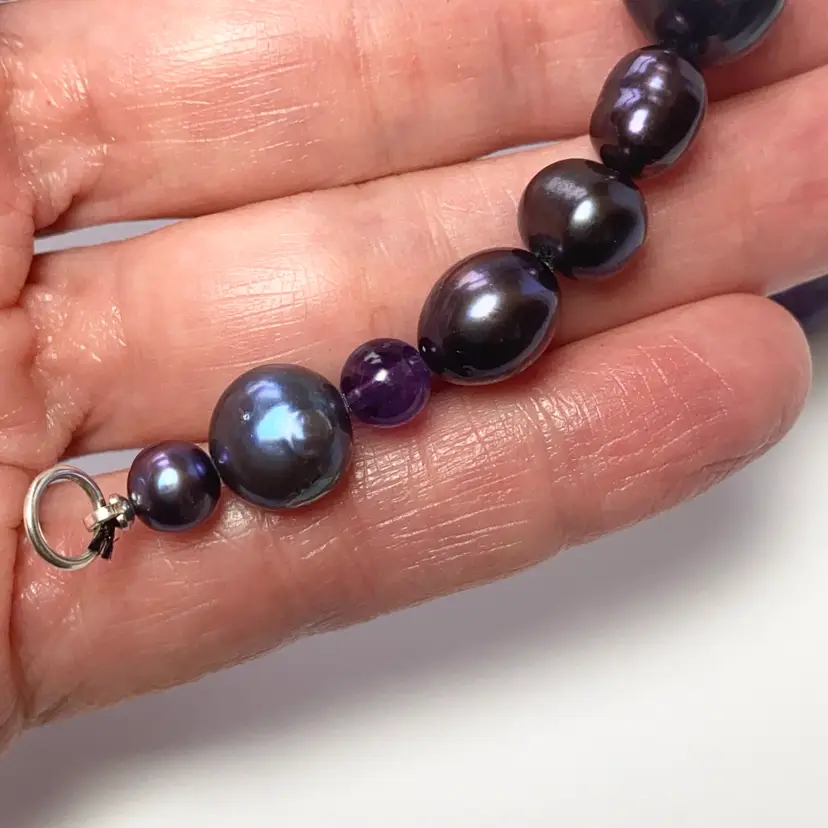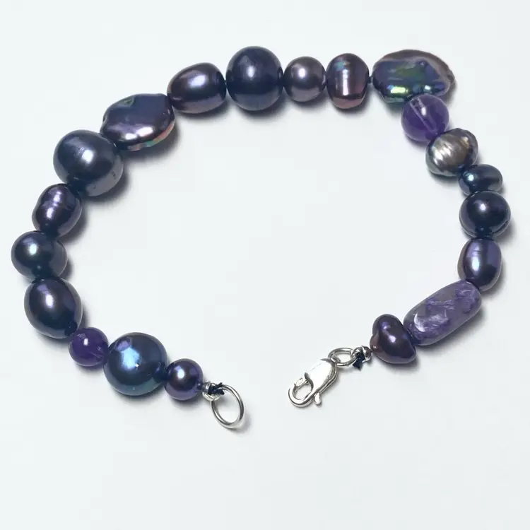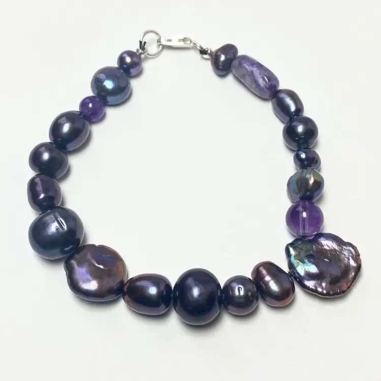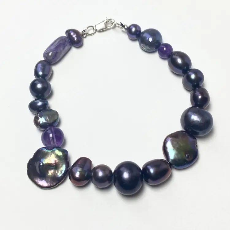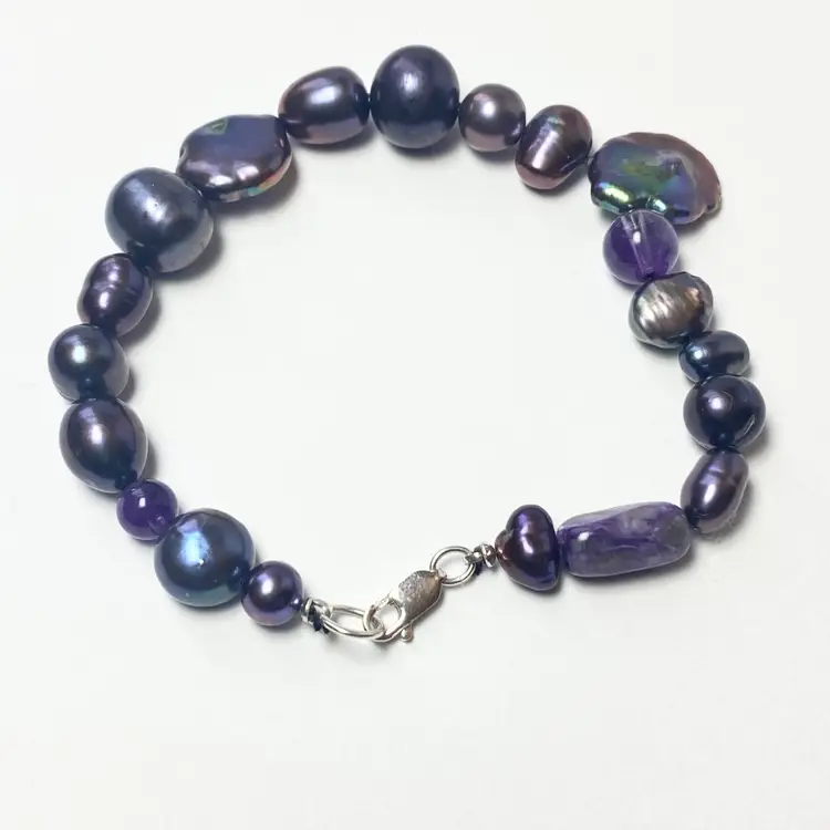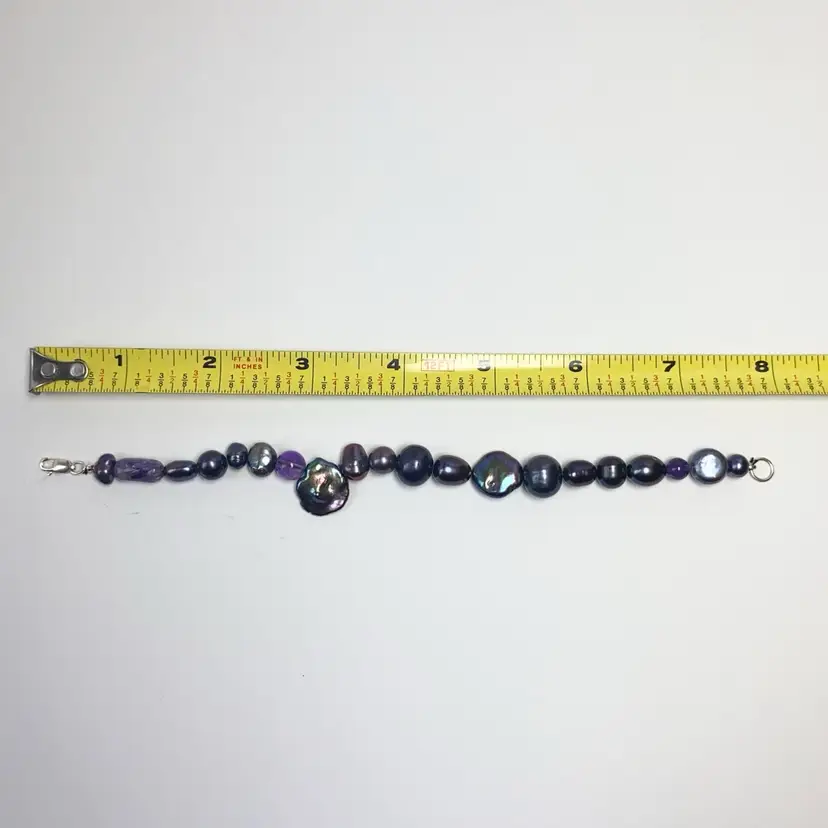 Genuine Dyed Freshwater Peacock Baroque Pearls & Amethyst Beads 925 Silver Bracelet. Good condition. Please see pictures for details. SMOKE FREE/PET FREE HOME Approximate measurements: Length- 8"