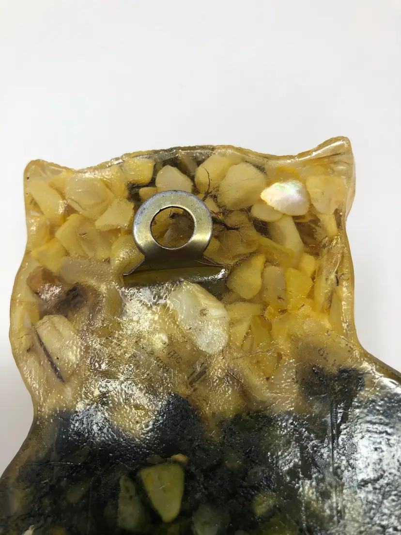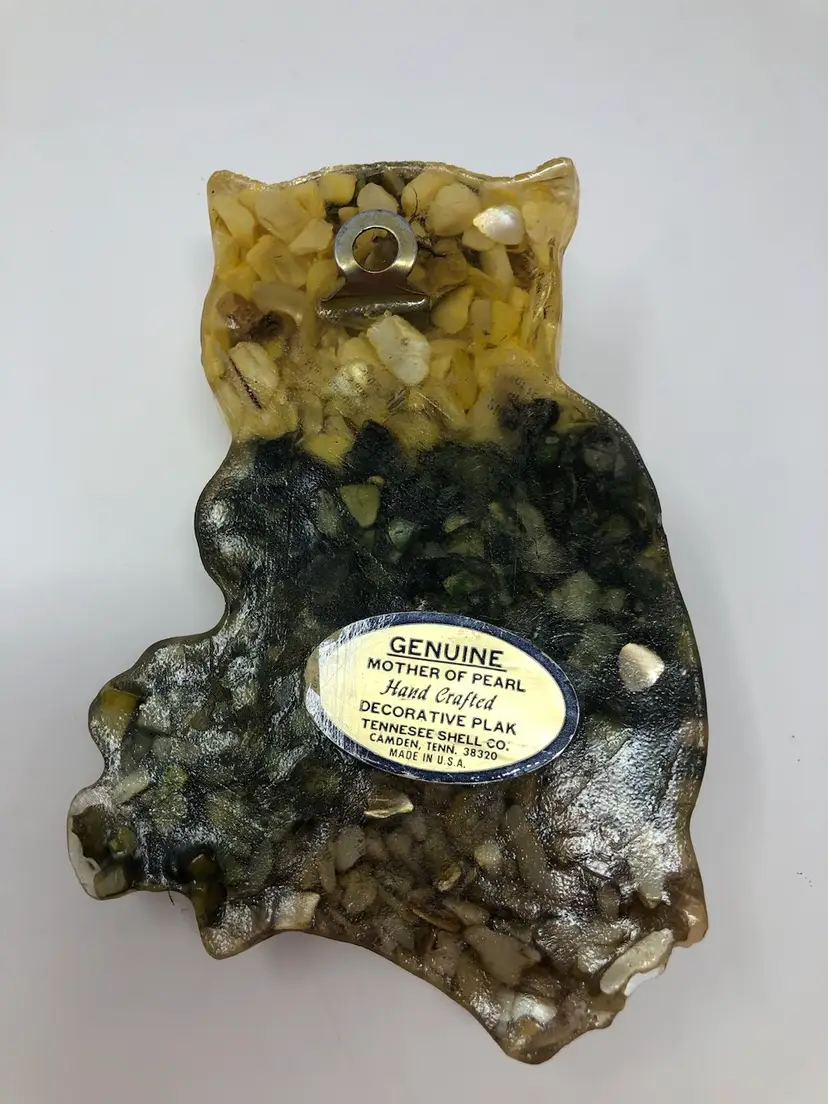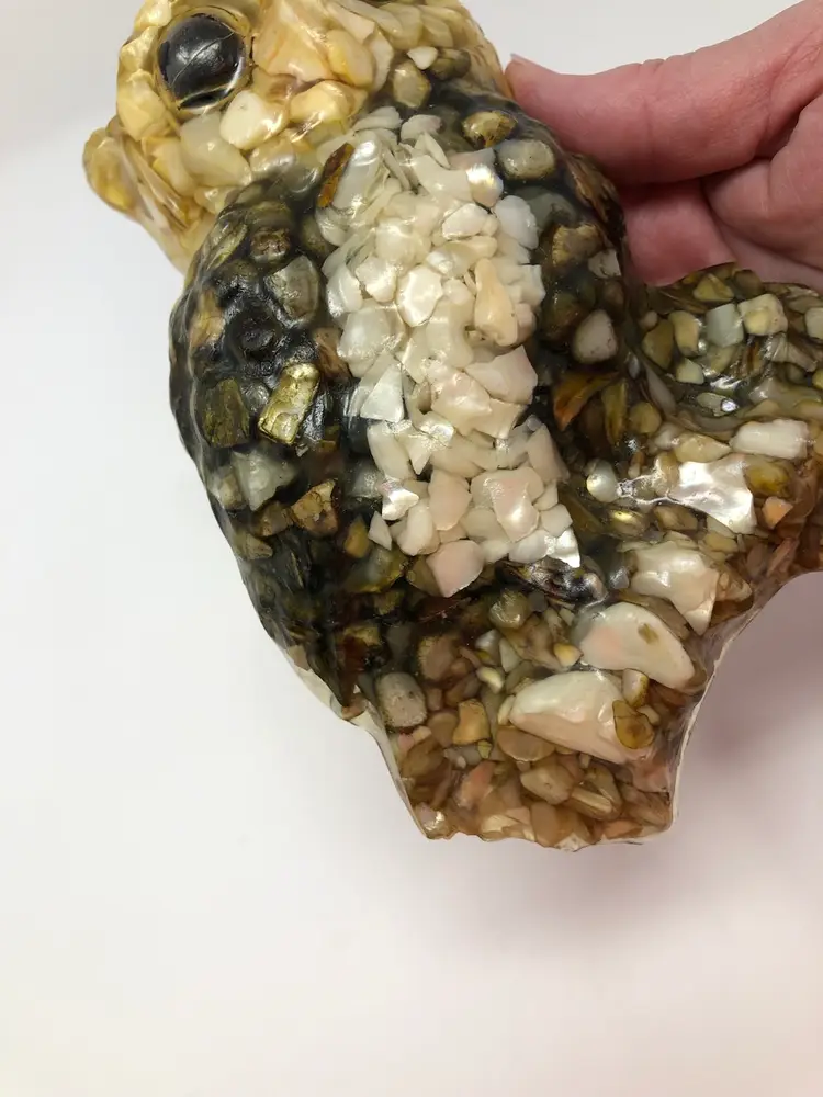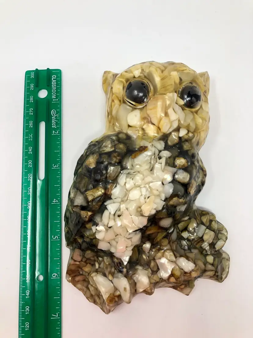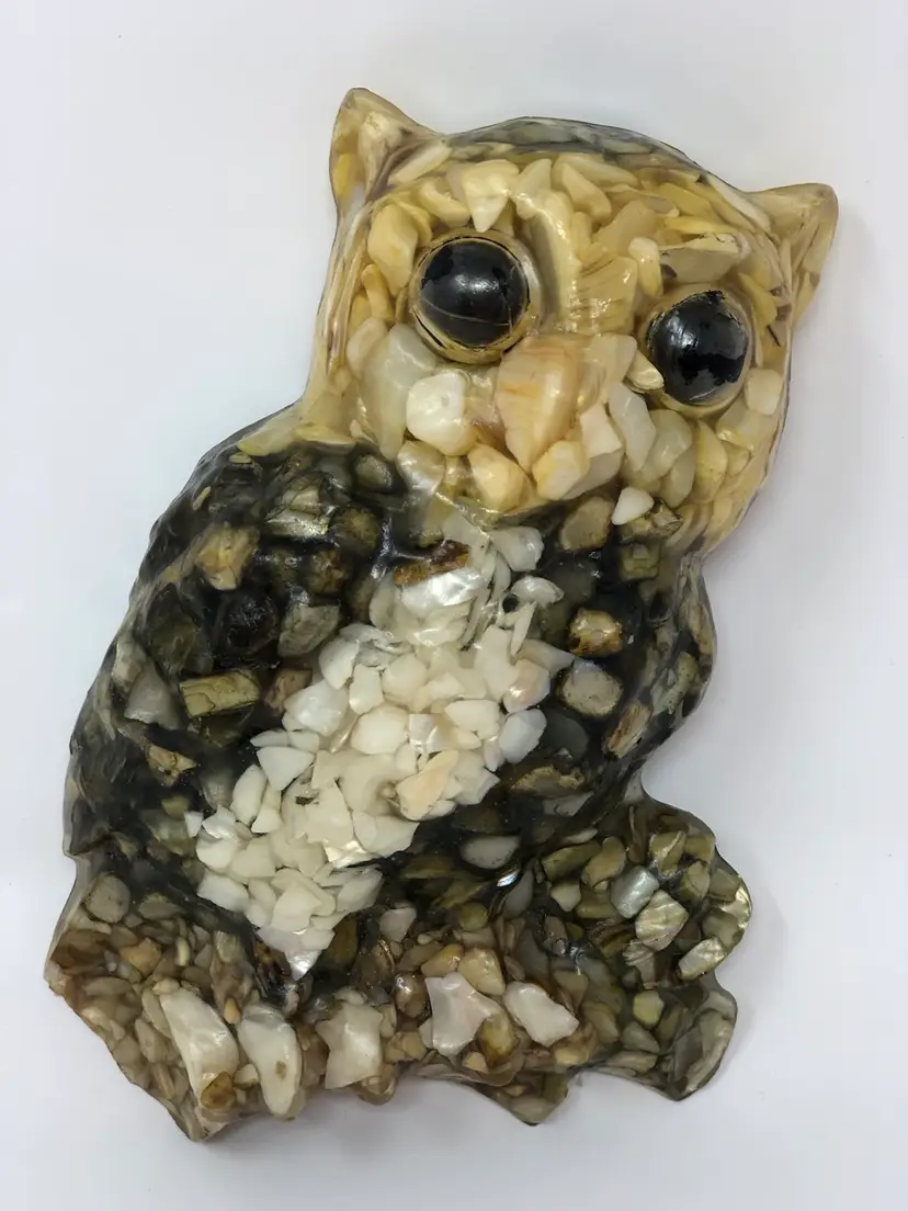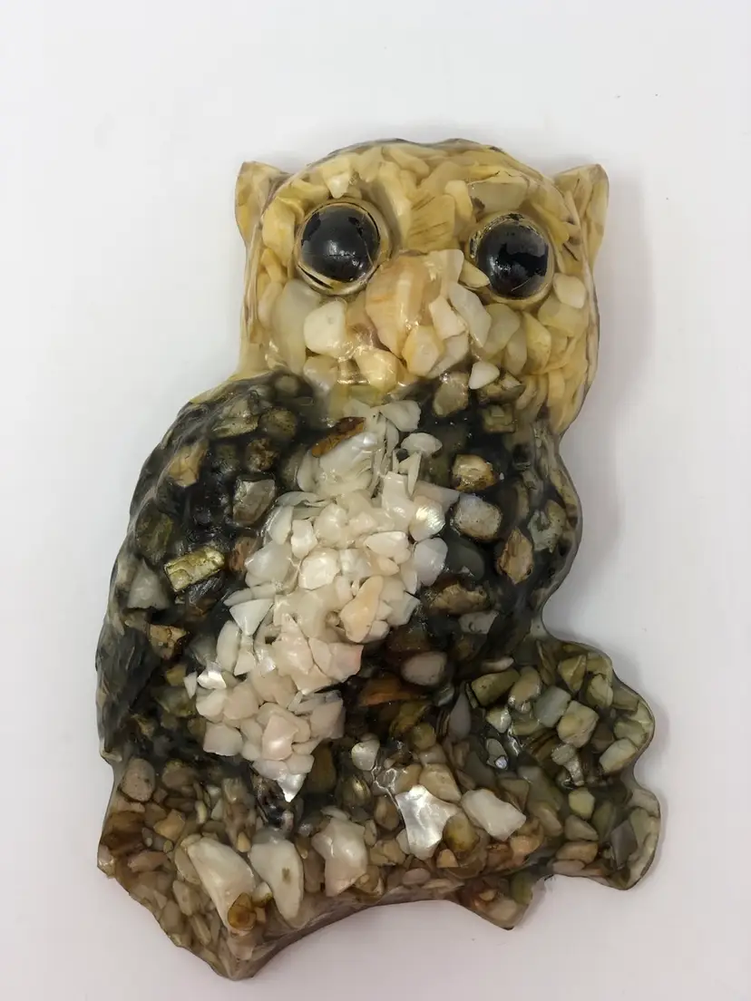 So strange! Multi colored shells arranged in a lucite suspension and formed into the shape of a perching big eyed owl. Bracket on the back for hanging. Made in the USA by the Tennessee Shell Company. Slight damage on the tip of the tail as shown in photos