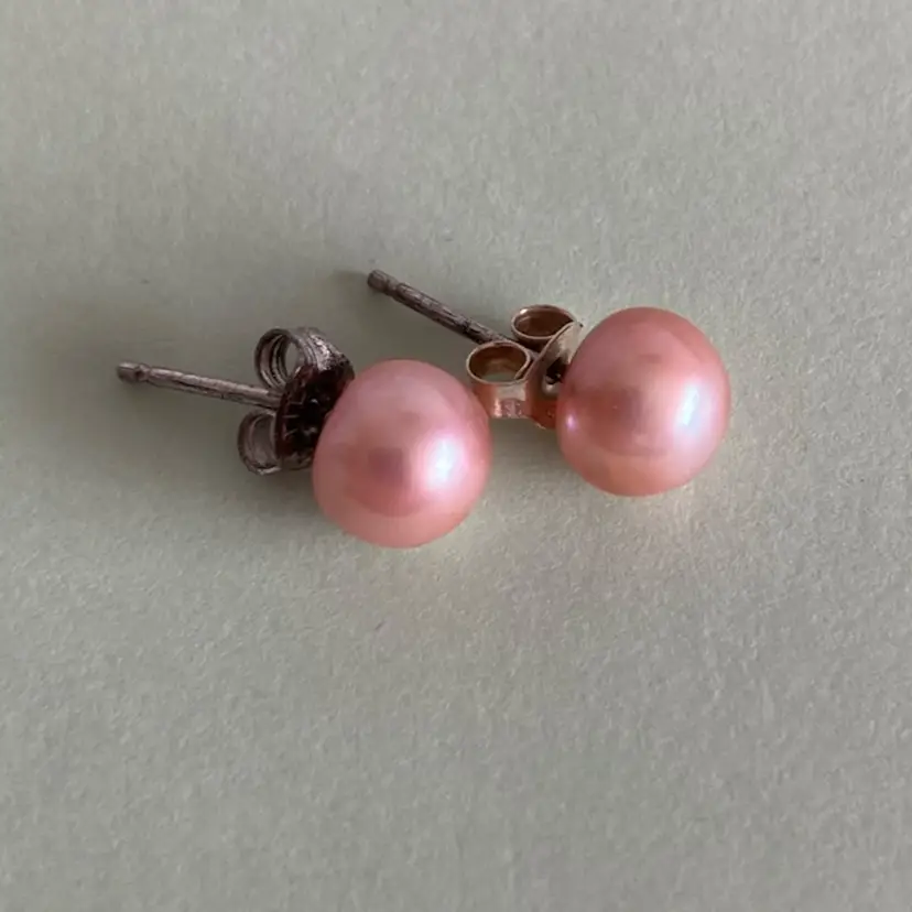Genuine pearl button earrings in pink tone. The pearls are pinker than the pics demonstrate. I tried everything to get the camera to cooperate, but it did not lol. They measure pearls measure 1/3” across. Marked 925 and signed. These do need polishing up.
