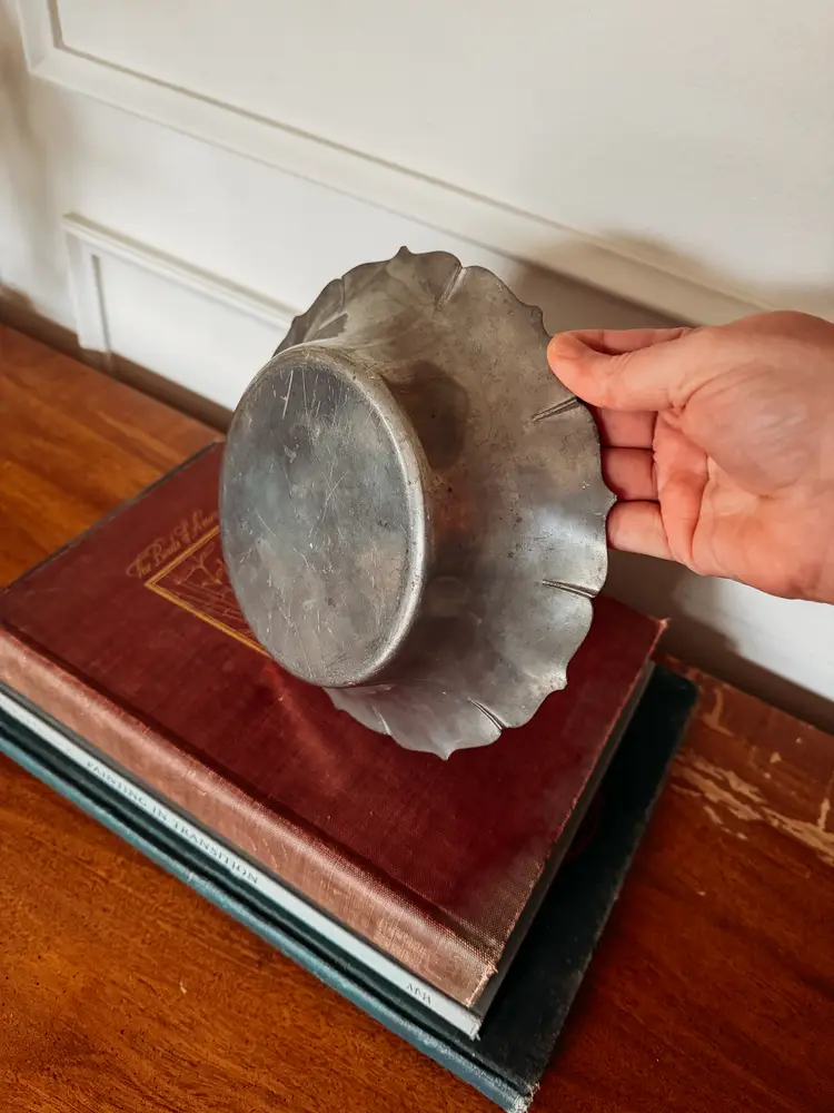 2.5" tall 9" in diameter a few small dents and scratches and some patina, but the floral inspired detail is lovely!