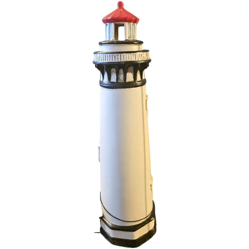 Charming lighthouse figurine by Lefton. Features red and white accents. Perfect for nautical decor.