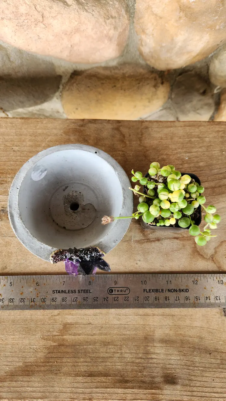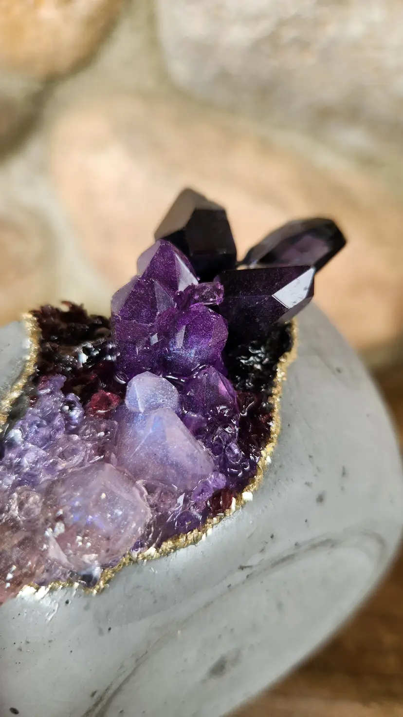 A concrete pot made with a special cavity for crystals to "grow" out of - each one is unique, one of a kind, and cannot be duplicated.