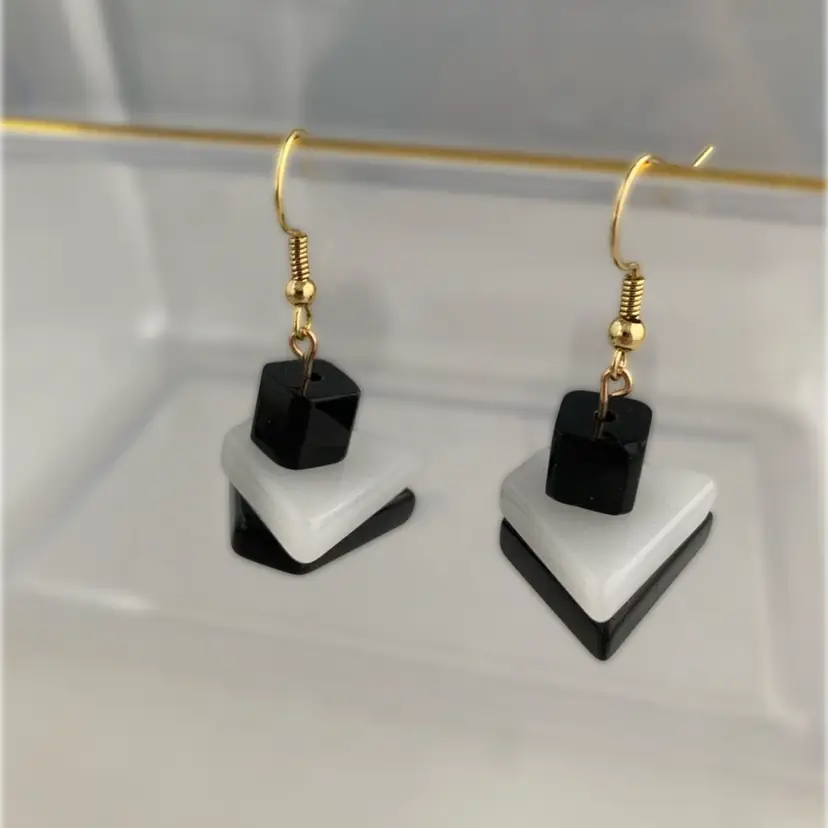 Geometric stacked black and white glass earrings. This is a one of a kind upcycle design using vintage beads and findings. The earrings measure 7/8” across and dangle 1 5/8”.