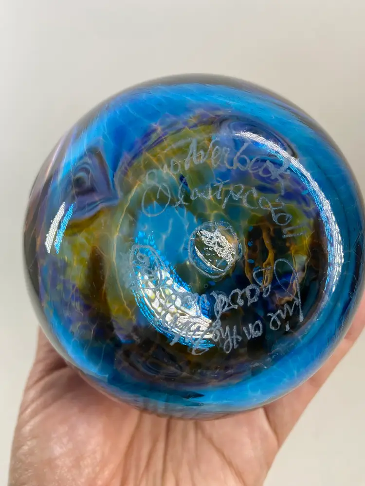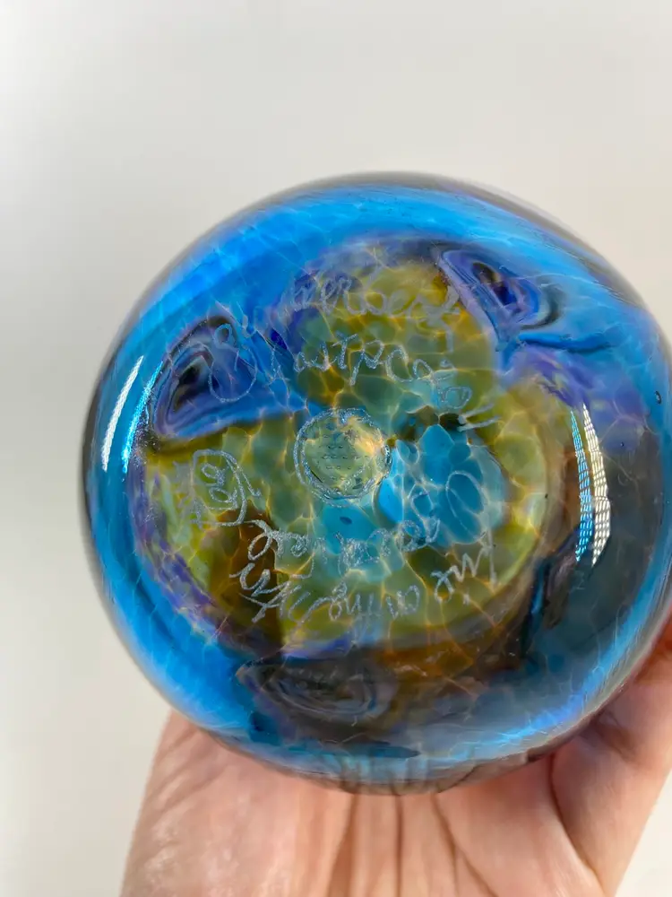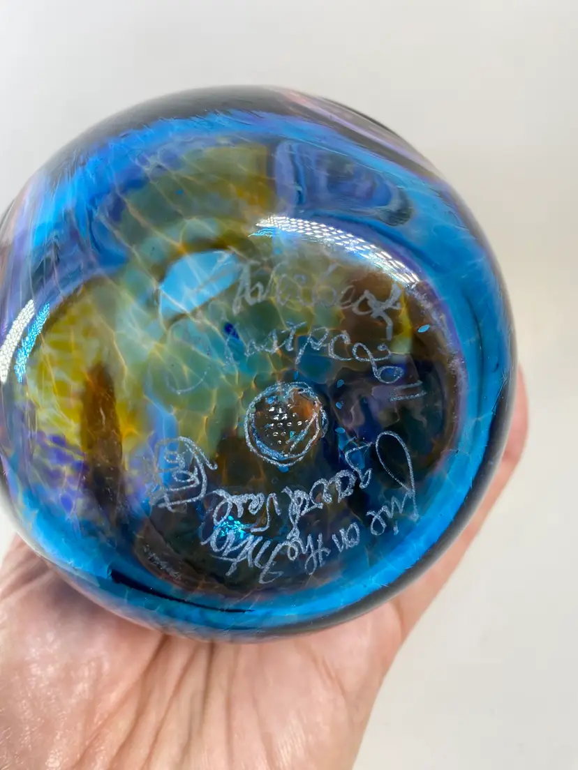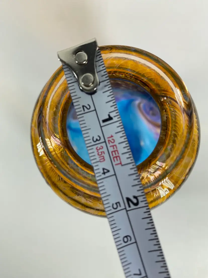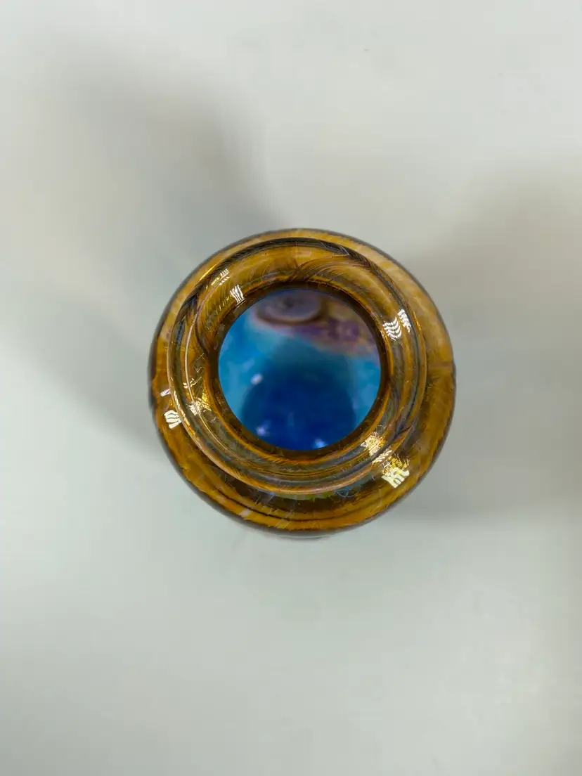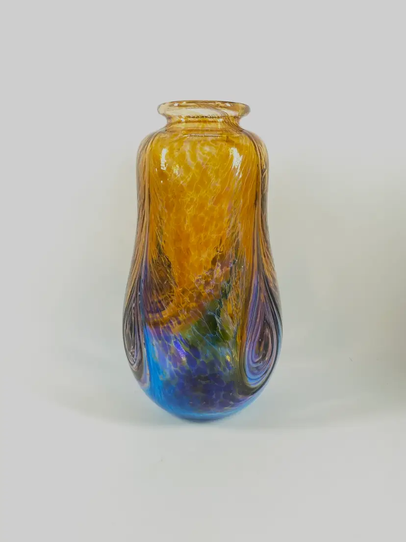 No chips or crack. Signed on the bottom. It measures approx 6-5/8” height x 2” in diameter at the opening, 3-3/4” in diameter width.